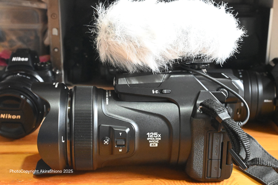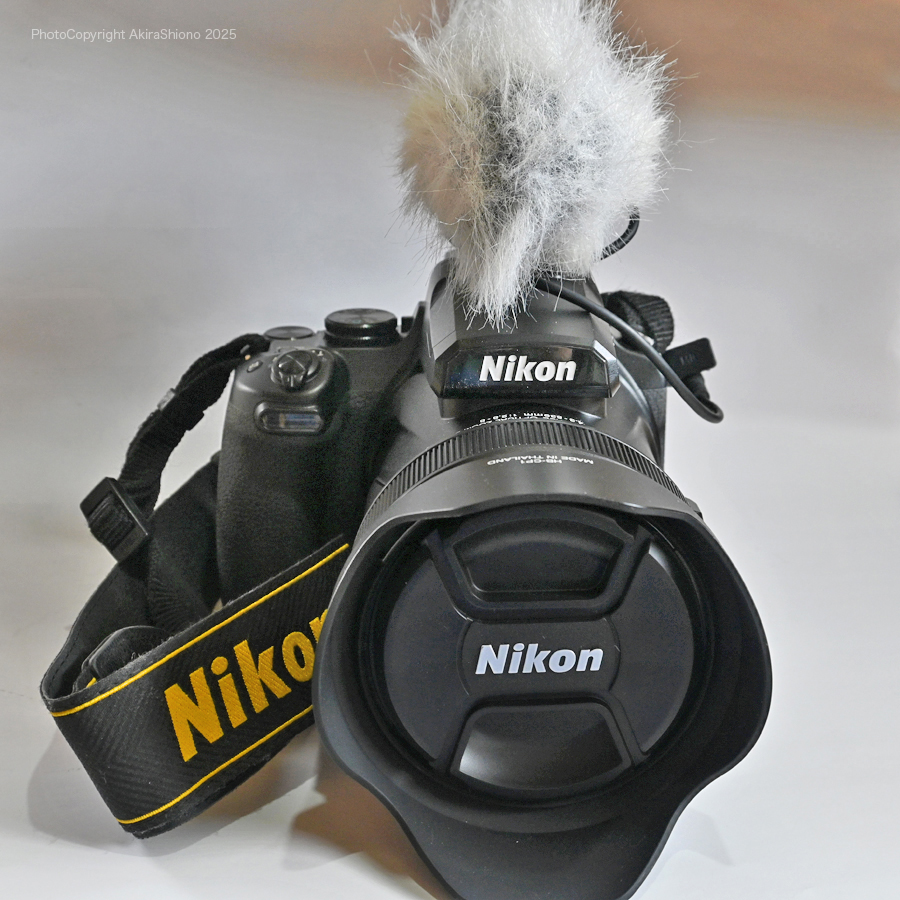このCOOLPIX P1100にはズームステレオマイクが搭載されています。殆どのカメラのマイクは風対策されていないので、カメラによっては微風でも「ゴソゴソ」音が入りますし、強めの風だと「バリバリ」と動画を台無しにする様な大きな雑音が入ってしまいます。綺麗な音を撮るためにはTVのロケ撮影などで使われているマフが重要になってきます。この素材はかなり優秀です。 COOLPIX P1100を使いやすくするアクセサリー ▲TOP