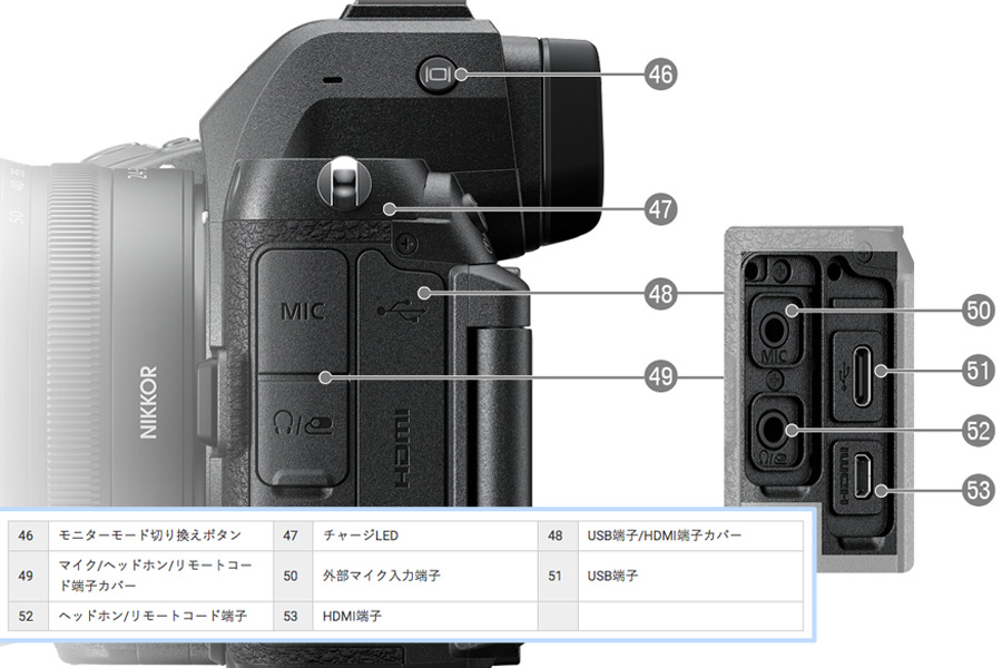 上面を見て大きく変わったのは、軍艦部がZ8の様に大きくなり見た目に重厚感がアップしました。ファインダー左肩に型番が印字され、スピーカがモードダイア右から左肩へ移動されています。また右肩にはピクチャコントロールボタンが新設置されています。このボタンは背面側から親指を使う方が押し易いです。 Z5IIは初代のZ5に比べ側面から見ても軍艦部が大きくなりデザイン的によくなりました。左側にある側面カバーの中にあるインターフェイスは、USB-C端子、HDMI端子、マイク端子、ヘッドフォン端子ですが、初代から1つ減り、リモートコード端子がヘッドフォン兼用の三極のミニプラグに変更されましたので、以前の専用品MC-DC2は使えなくなりました。 NIKON Z5からZ5II高性能化した箇所 トップへ