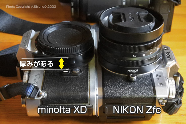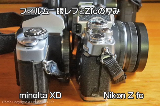 40年くらい前に使っていたフィルム一眼レフの「minolta XD」と、このZfcの大きさを比較してみました。 Zfcのホールドをアップするアクセサリー トップへ