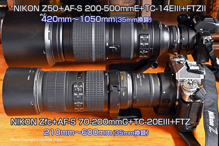 Zfcの基本性能は、連写も11コマ/秒でZ50とほぼ一緒なので、超望遠レンズを装着すれば野鳥撮影もできます。しかしZ50の様にグリップが深くないので、重いレンズをぶら下げて持つには向いていません。この機種で超望遠レンズ撮影をする場合は、アシストグリップがあると安心です。 ![]() ZfcにFTZII+TC-14EIII+AF-S200_500mm 5.6Eを接続。 35mm換算の焦点距離は450mm~1125mm テレコン無しでは35mm換算の焦点距離は300~750mm。 ![]() Z50にFTZII+TC-14EIII+AF-S200_500mm 5.6EをZfcに+FTZ+TC-20EIII+AF-S 70-200mmGをFTZ接続した状態 テレコン・マウントアダプターを見る