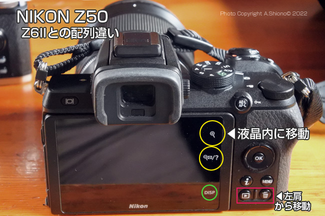 通常使用のカメラはZ6IIで、野鳥撮影ではDXの特性の望遠機能が優れているZ50を最近はメインにしています。このZ50はダブルズーキットで、一般には入門機というカテゴリーになっています。被写体によってレンズ交換できます。そのレンズ交換ですが、知らず知らずの内にゴミが入っています。それに気づくのが背景が空などフラットな場合が特に目立ちます。このようにレンズ交換には意外にリスクがあります。 機種ごとに違う操作ボタンの配置 トップへ ZシリーズのDXフォーマットは、先日Z30が販売されましたがその前にはZ50が発売されています。1台のみ使っている方では問題が出ないと思いますが、複数台使っている方には、機種ごと操作ボタン配置が違う事です。一番違うのがZ50で、カメラが小型化された為に上位機種のZ6〜との背面のボタン配列が違ってる所です。特に再生ボタンとゴミ箱がジョグダイアル右下に移動して、その代わりにモニター表示切り替えボタンがあります。そしてジョグダイアル左下にあった再生画像の拡大ボタンが、液晶モニター内のタッチセンサーボタンとなっていました。この様に撮影対象を変えるなど持ち替えた時にボタンの位置を再確認することになります。 上の2枚の画像は、NIKON Z6IIとZ50の背面のボタン配列の比較です。一つ上の画像のZfcと比べてみることにします。Zfcは背面に余裕があるのでジョイスティックは無いものの、上位機種のZ6IIに近い配列になっていますので、上位機種のサブカメラとしてもZ50よりは自然に操作出来ると思います。 一昔前のフィルム一眼レフに近いボディの厚さ トップへ