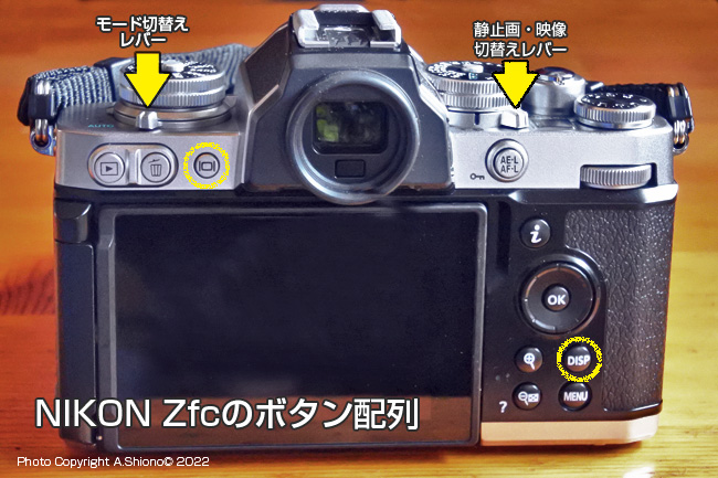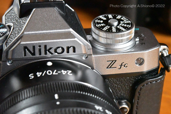 カメラ上部には、右肩には右から露出補正ダイヤル、電源スイッチ、シャッターボタン、手前に絞り値表示小窓、静止画・動画切り替えレバー、シャッターダイヤル。左肩は、モードレバー、ISO感度設定ダイヤルとなっています。 ![]() Zfcのエンブレムは 彫刻+墨入れ