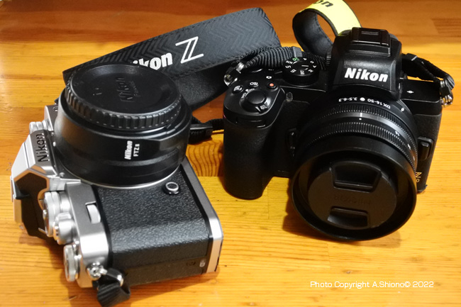 ![]() ZfcにFTZIIマウントアダプターを介して接続したマクロ60mmf2.8(35mm換算90mm)GとZ50−250mm。 右はZfc+FTZII+標準ズームAF-S 24-85mmGで、35mm換算で36〜127mm ![]() Zfcに接続したFTZIIとZ50+16-50mVRレンズで35mm換算の焦点距離は24〜75mmになります。