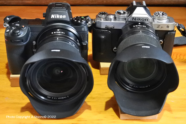 Fマウントレンズ資産がある方は、一部旧タイプの物を除いて「FTZマウントアダプター」を使えば、何の遜色もなく以前と同じ様に撮影する事ができます。小さい径のマウント金具がFマウントで、レンズに接続する側で、反対側の大きな径の金具がZマウントになり、こちらがZカメラに接続する側になります。ただの筒状のものに見えますが、電子接点が装備され、従来通り使用することができます。ちなみにAPS-Cカメラに接続した場合は、焦点距離が1.5倍になりますので、望遠には有利ですが広角レンズでは画角が狭くなってしまいます。ここには2タイプのFTZマウントアダプターが写っていますが、三脚台座があるものが、初代で、無い方が「FTZII」となっています。こちらは縦位置グリップ付きのZ9の様なカメラでも縦位置でも邪魔にならない様になっています。
