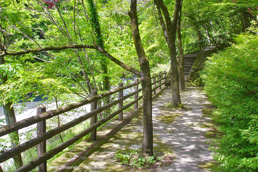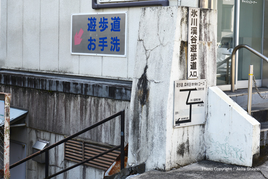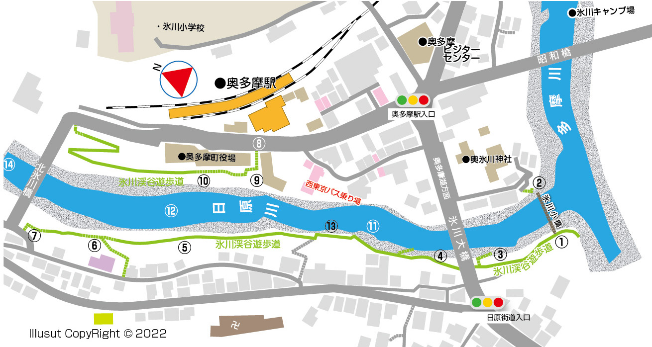 奥多摩駅近くに流れる「日原川」から多摩川合流付近のマップです。JR青梅線の終点の奥多摩駅近くに流れるこの日原川は、右岸・左岸共に遊歩道が北氷川橋まで伸びています。左岸(駅側)は⑧奥多摩町役場脇の路地から始まり、北氷川橋を渡り右岸の遊歩道が⑦の位置から始まります。この遊歩道は多摩川合流近くに架かる「氷川小橋」まで続きさらに先は登計橋(つりばし)まで続きます。橋を渡ったその先は、多摩川の昭和橋の右岸の袂へと続きます。 ![]() 奥多摩駅近くの日原川に沿う氷川渓谷遊歩道(緑線部分)※クリックで1310x698pixまで拡大できます。 ![]() ①氷川渓谷遊歩道の西側の入口