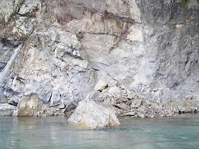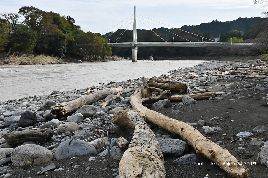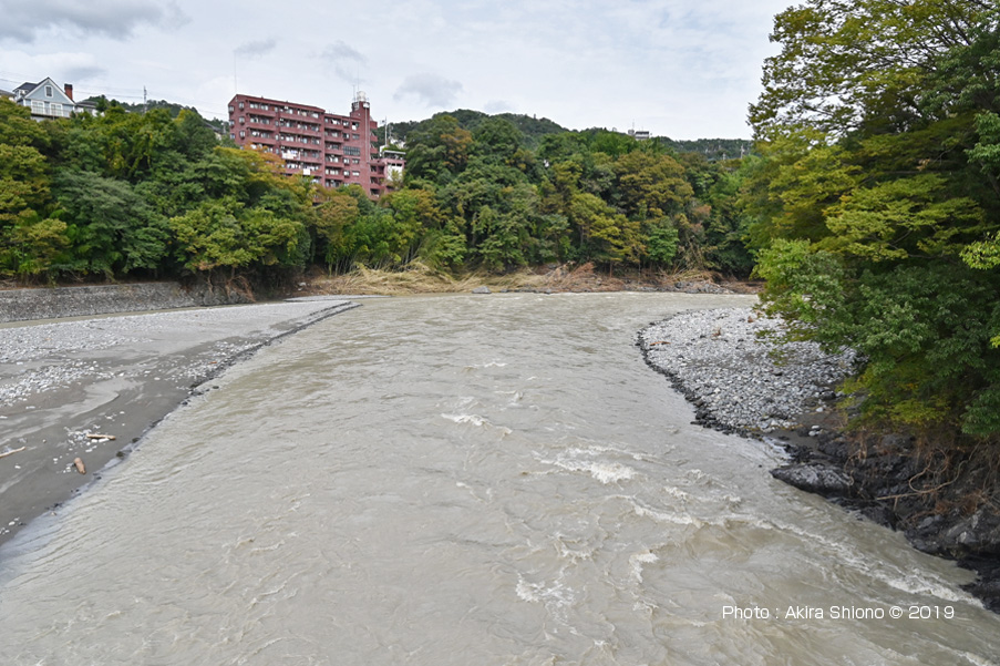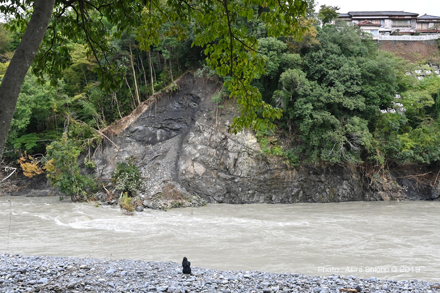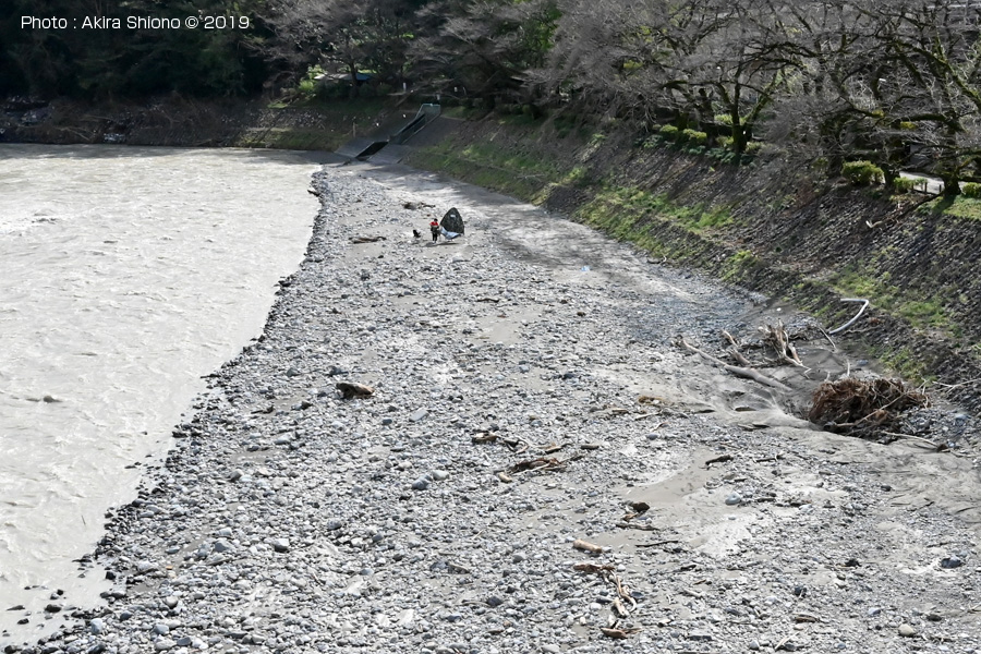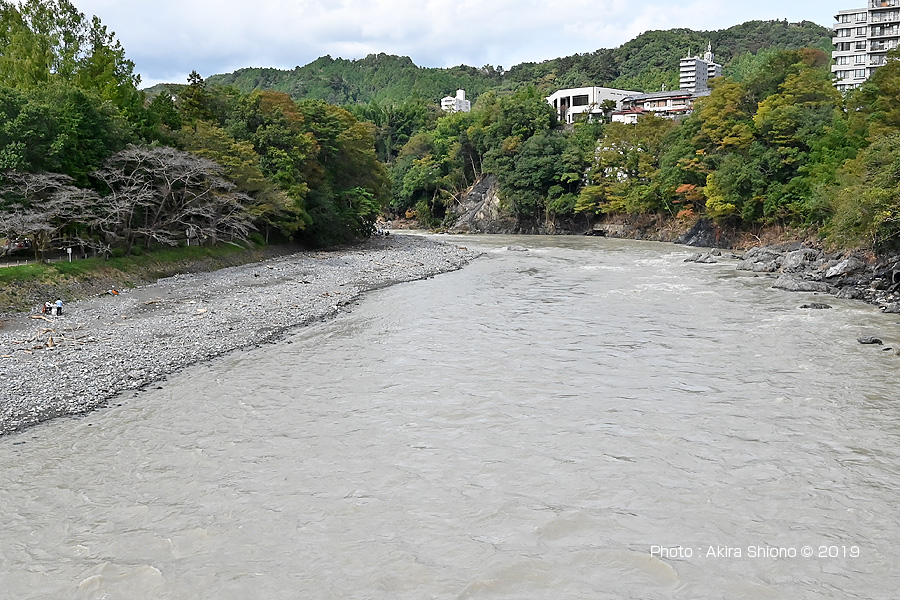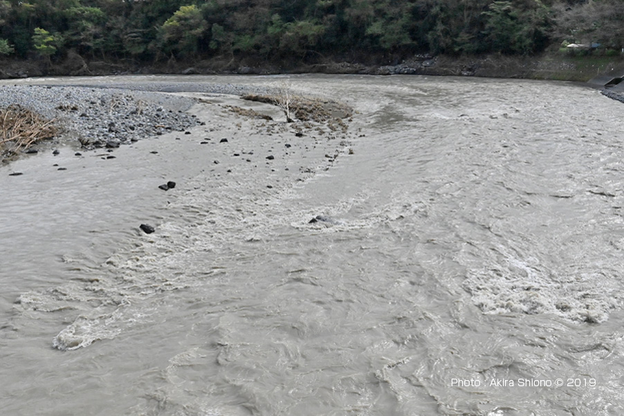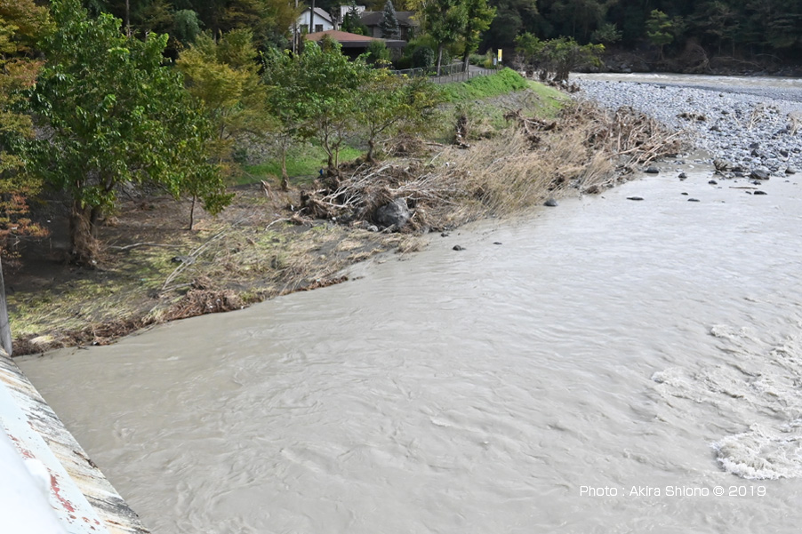 鮎美橋/釜の淵公園の橋の台風後の景色 トップへ 青梅市の釜の淵公園の東側に架かる「鮎美橋」は上流側にある岩盤で大きくUの字型に曲がって、「かんぽの宿」下の釜の淵の大岩に流れがさらに曲がりこの柳淵橋へと流れてきます。この流れはその時々によって表情を変えます。以前は柳淵橋下の河原には、大水で流された大量の砂利が中央に流され盛り上がり、流れが左右岸の両脇に流れていたことがありました。左の写真は、多摩川の流れは、橋の右岸と中央付近になっています。 鮎美橋:台風後の下流の景色 トップへ 右画像は2019.10鮎美橋の下流側の川の流れです。突き当たりは岩盤になっていて、ぶつかった流れは、左側に曲がって調布橋方向へと流れていきます。左岸側にたくさんの葦原などの草原が広がっていましたが、、流れによってなぎ倒されていました。橋下流の中央部分には岩がありますが水没してい波立っています。左岸に見える小高い木は流されてしまった様です。右岸は、この日は砂利の岸が出ていましたが、取り残された流木などがかたまっていました。 崖崩れが起きた対岸の岩壁 トップへ 大型台風の影響は、豪雨に伴い上流の山々に吸い込んだ薄いが、沢などから吹き出し、河川に流れ込みます。この時に水辺の土砂を削り、雨水に溶け込み流れて来ます。また、多摩川は上流に小河内ダムがあり、ここの放水で濁った水が流れてくることが多いようです。もう一つは嵩を増した水位が岸辺の構造物を壊したり、流してしまったりします。もう一つは斜面の壁などに雨水が大量に浸み込む、重さに耐えきれなくなって滑り落ちる「崖崩れ」です。ここ釜の淵公園でも多摩川の逆Uの字の北側の崖(青梅市立美術館南)がこの台風の雨で崩れました。調べて見ると2005.3.6に釣行した時にこの辺りの岸壁から大きな岩が落ちていたことがありました。今回は上の斜面が崩れた様に見えます。 柳淵橋/釜の淵公園の橋の台風後の景色 トップへ 青梅市の釜の淵公園の西側に架かる「柳淵橋」は上流側にある岩盤で大きく左(左岸)側に曲がって、「かんぽの宿」下の釜の淵の大岩に流れがさらに曲がりこの柳淵橋へと流れてきます。この流れはその時々によって表情を変えます。以前は柳淵橋下の河原には、大水で流された大量の砂利が中央に流され盛り上がり、流れが左右岸の両脇に流れていたことがありました。左の写真は、多摩川の流れは、橋の右岸と中央付近になっています。 2019台風19号柳淵橋下流の景色 トップへ 右画像は2019年9〜10月の台風15号、19号襲来前の2019.7柳淵橋の下流側の川の流れです。左岸側に大量の砂利が堆積していて、流れは左岸側と右岸側とに偏っています。中央部分の流れは右岸の流れよりも少し高くなっているので、橋の下流側で合流します。この流れは正面奥の岩盤にぶつかり大きくUの字型に曲がり下流側の方向へと流れていきます。しかしこの流れは2019.9.23には左(左岸)の流れは見えませんでした。流れはこの後一番奥のマンションが見える右下で本流と合流します。 釜の淵公園の場所と地形 トップへ