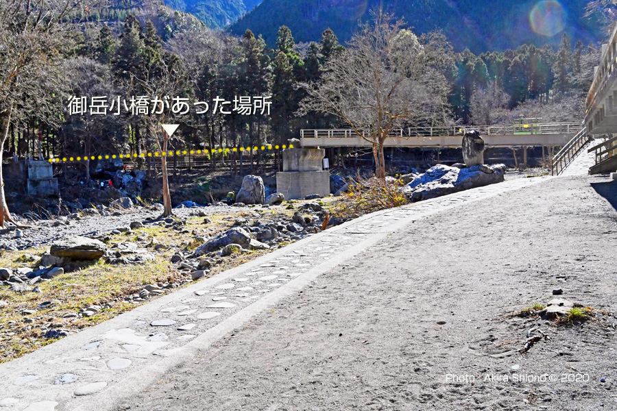 御岳渓谷川に近い位置で左岸を右岸を結んでいた御岳小橋。(撮影:2020年2月)