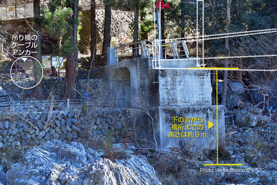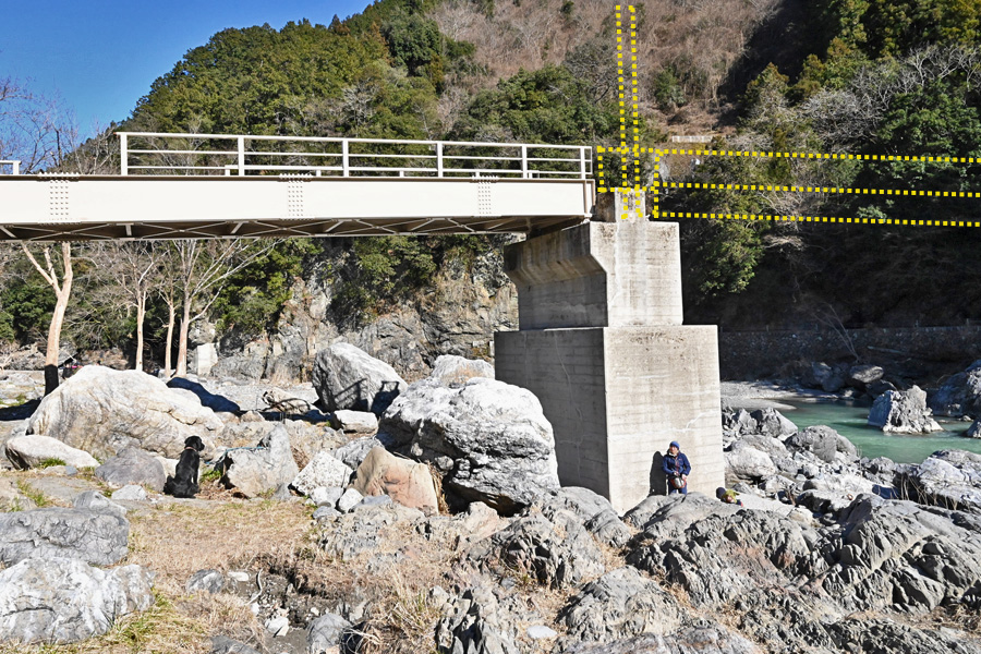 御岳渓谷川に近い位置で左岸を右岸を結んでいた御岳小橋。黄色の破線は、消失した橋桁と主塔の位置。(撮影:2020年2月) 中央部が流失した御岳小橋:右岸の景色