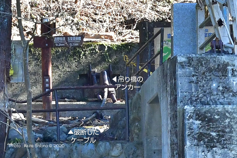 御岳小橋の右岸で橋桁が主塔とともに無くなっています。またアンカーやワイヤー類も消失しています。(撮影:2020年2月)