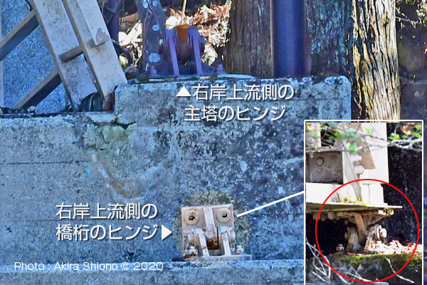 ![]() 御岳小橋の右岸も橋桁、主塔もヒンジ部分から千切れ構造物は折れ曲がっています。(撮影:2020年2月) 残ったヒンジ部分と千切れた主塔ヒンジ