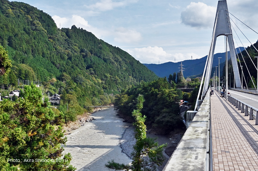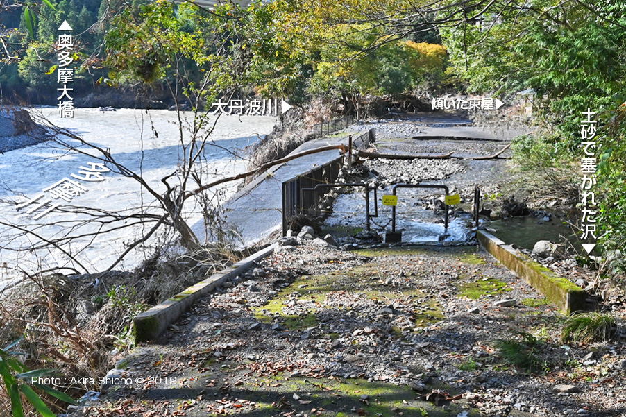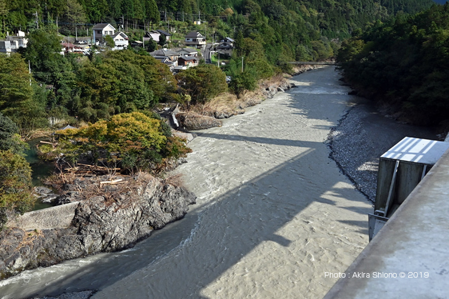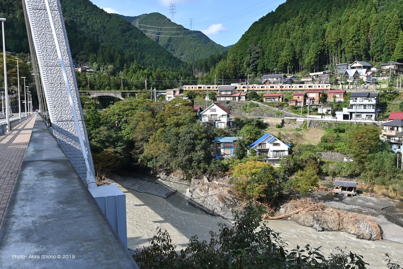 2019年の9/5に日本列島の東側に襲来した、台風15号は各地に大きな被害をもたらしました。また・10/9には台風19号が引き続き襲来しました。上の写真は20日後の奥多摩大橋の風景です。奥多摩町にある多摩川にかかる橋の中では、指折りの大型の斜張橋です。対向に各1車線、左右に広めの歩行専用道が整備されています。この橋は青梅市から奥多摩町へ向かう吉野街道と青梅街道の接続する非常に大切な橋となっています。