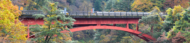![]() 橋名板はデザインされた橋柱に金属板に彫られたものが嵌め込まれています。下には黒御影石にキジと景色が彫られています。 愛宕橋の遠景風景 トップへ こちらは、隣の弁天橋から撮影した愛宕橋の写真です。赤く塗装されたアーチ構造で景色に映えます。またこの橋は、海沢方面へ繋がる「愛宕トンネル」に入るための橋でもあり、トンネルの入口は左側にあります。