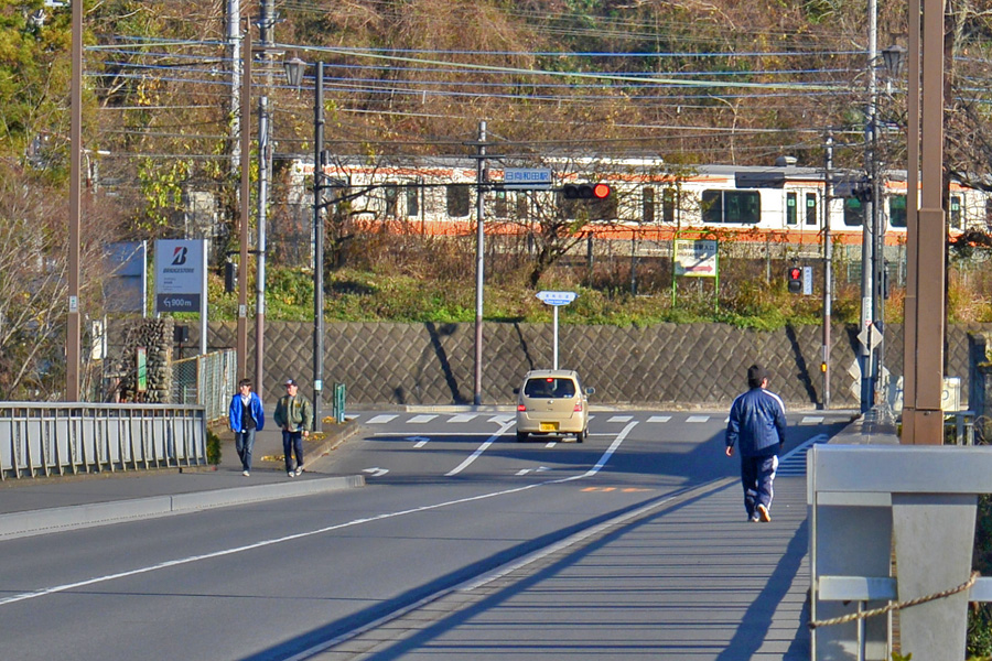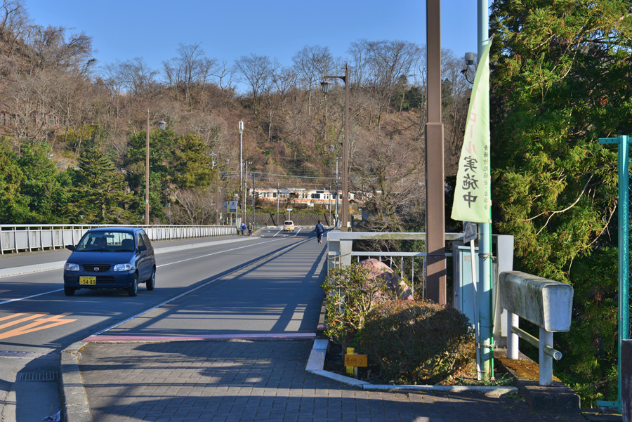 神代橋南端から北をみた景色で、向かいは「日向和田駅」でちょうどJR青梅線が奥多摩へと向います