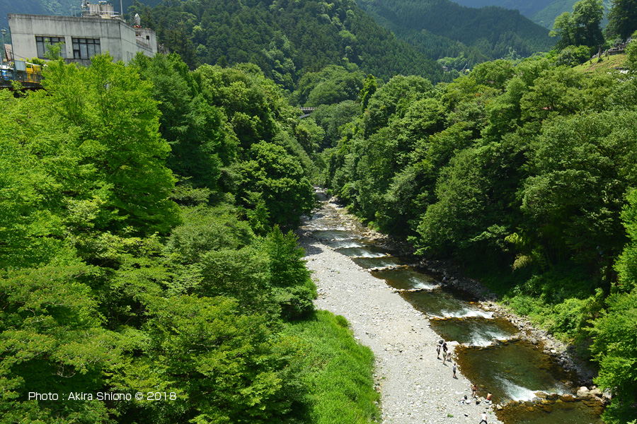 ![]() 左ー早春の日原川下流部の景色で、水が透き通っています。 右ー『夏の時期には渓谷の両岸の木々の葉の色が濃くなっています。