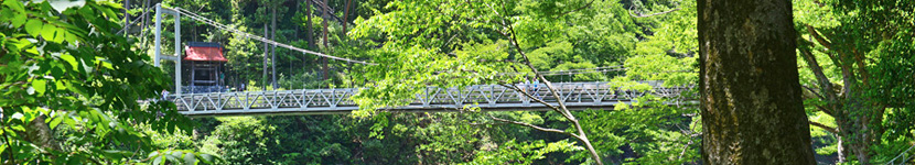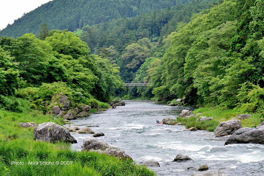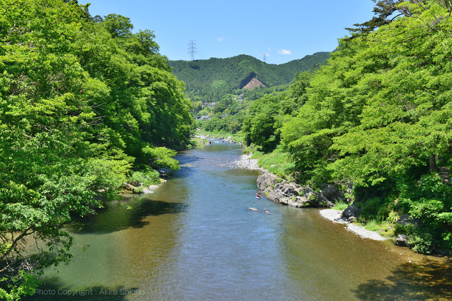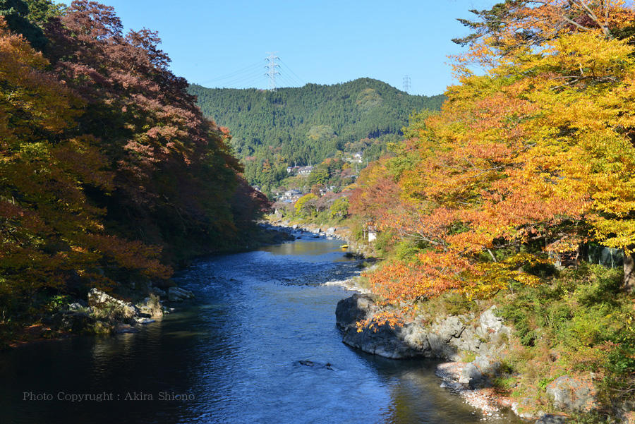 左の写真は、澤乃井ガーデン前の河原から、秋の楓橋を眺めた景色です。 右の写真は、楓橋下流の瀬の終わった辺りの河原からの春の景色です。 ![]() 上流の鵜の瀬橋近くから見た楓橋で下流に向かって流れ変化があり、カヌーやラフティングを楽しむ人に人気です。 御岳渓谷遊歩道からの楓橋の景色 トップへ