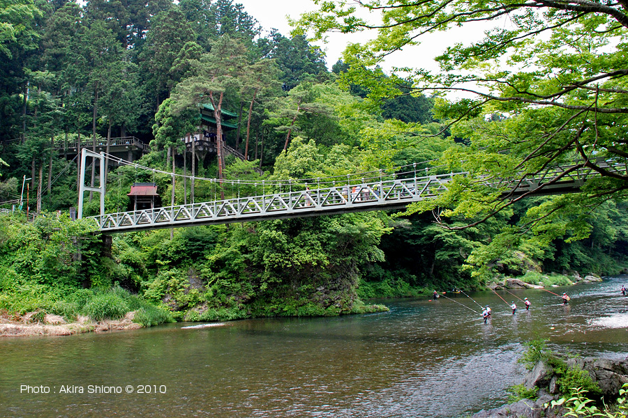楓橋の北側(沢井駅方面)には、先ほどご紹介しました小澤酒造(澤乃井)と、もうひとつ「豆腐料理」で有名な『ままごとや』があります。この楓橋を渡りきった南側には『寒山寺』と小澤酒造が経営する『かんざし美術館』があります。 楓橋の袂の寒山寺 トップへ ![]() 楓橋の下を流れる多摩川(上流部)の下流側から見た、楓橋と寒山寺の景色です。