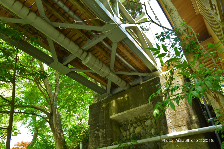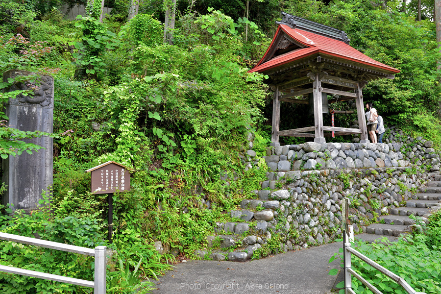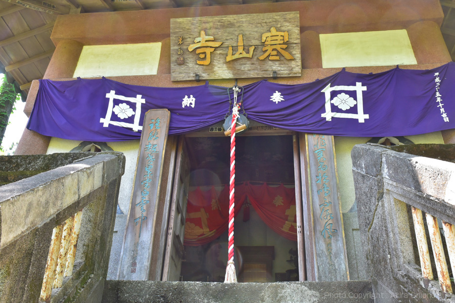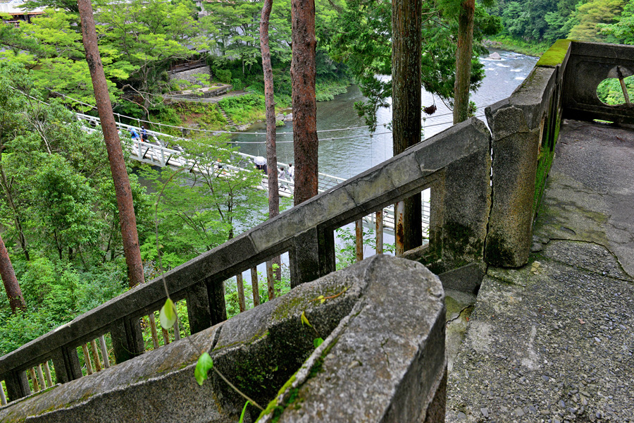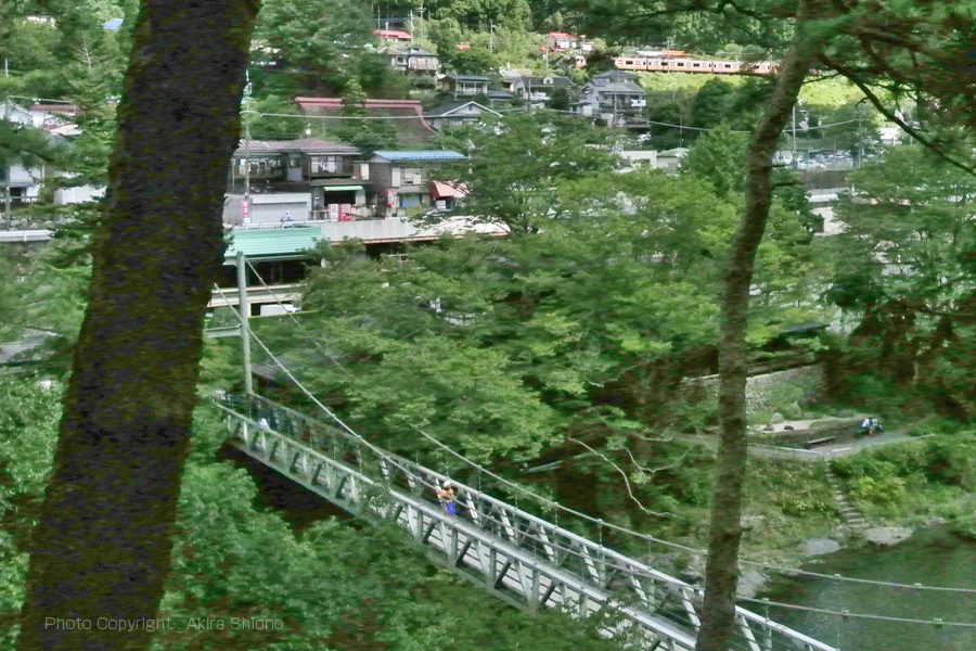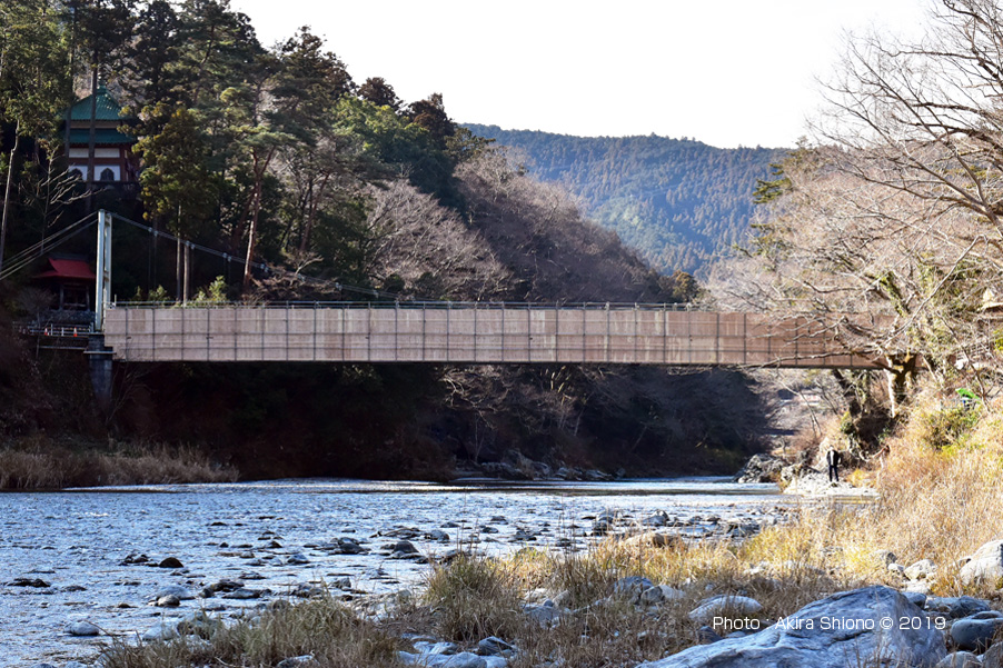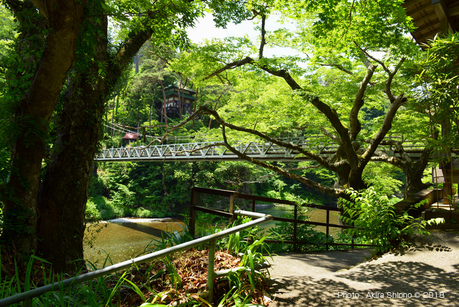 ![]() 急な石段を上りきると眼下に楓橋が架かっています。本堂の東には見晴らし台があり多摩川下流を一望できます。 楓橋の右岸(南側)には川の下流を見渡せる小高い位置に、この寒山寺があります。鐘突き堂は橋の袂の少し高い位置にあり、観光客がたまに鐘を突き景色に鐘の音がこだましています。更に急な石段を登ると本堂があります。建物は耐久性のある鉄筋コンクリートで出来ています。山側の一段高い近い場所には少し広くなった展望台があり、楓橋の下を流れる多摩川の瀬は、蛇行して大岩の多い下流部へと変化してゆきます。 【寒山寺とは】寒山寺は中国の蘇州にある寒山寺にちなんでいます。書家の田口米舫が明治18年(1885)に中国の姑蘇城外の寒山寺を訪れた際、主僧の祖信師より釈迦仏木1体を託されました。帰国後、昭和5(1930)年に小澤太平氏の協力によってここに寒山寺が建立されました。御岳渓谷の遊歩道沿いにひっそりと佇むお堂には、渓谷を散策に訪れた人々が立寄り、鐘をつく姿を見かけます。(資料:青梅市観光協会/観光情報寺・神社: 寒山寺より)
