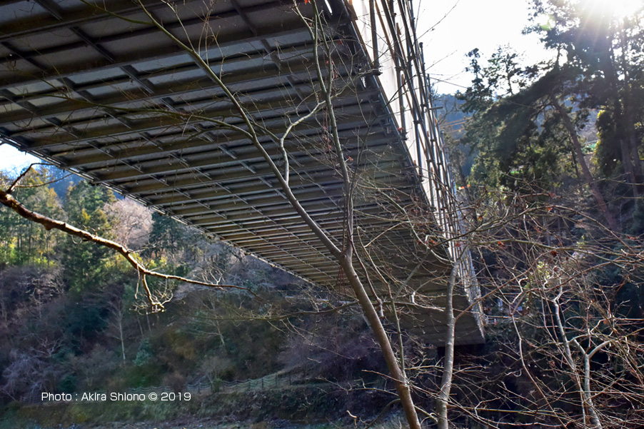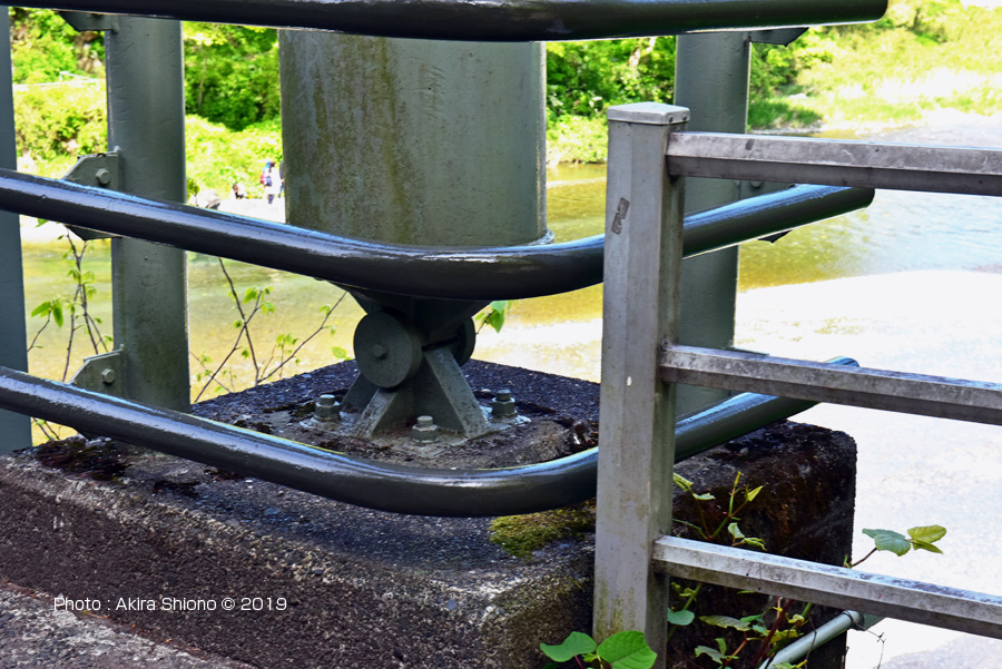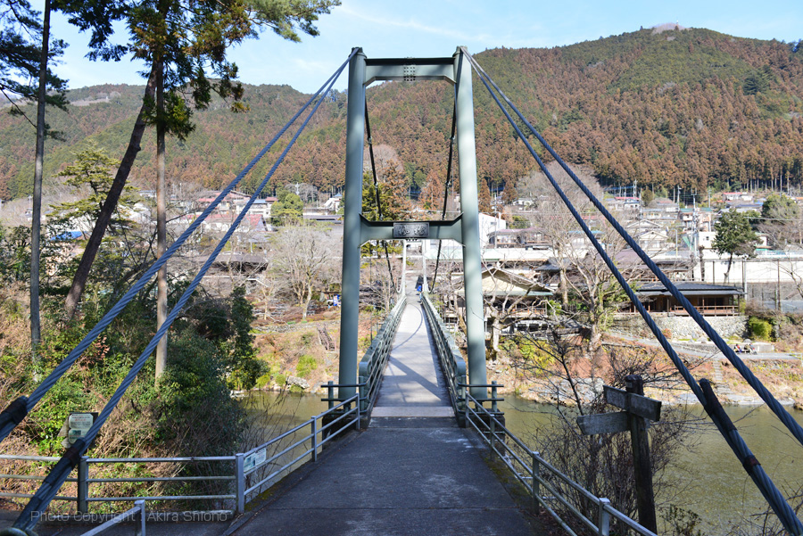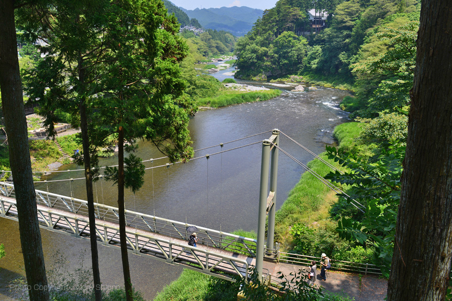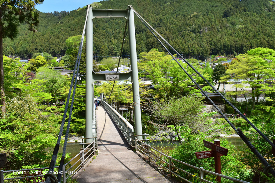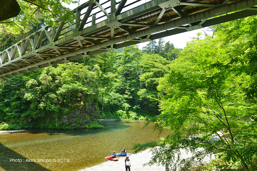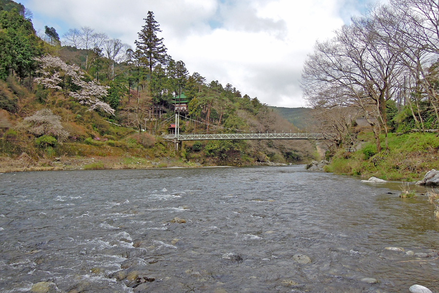 左ー楓橋下を潜る御岳渓谷遊歩道。と楓橋の裏側の景色 ![]() 下流の川の中からの楓橋の春の景色です。秋には左岸(写真右側)でモミジの紅葉が楽しめます。
