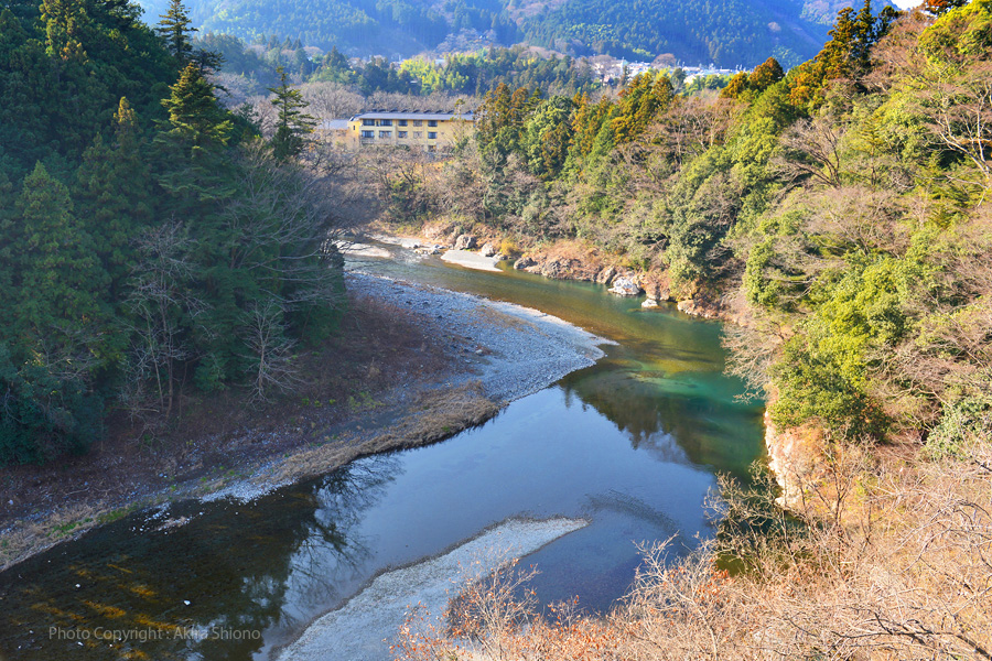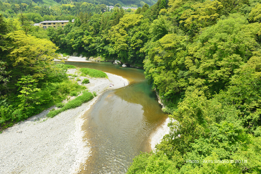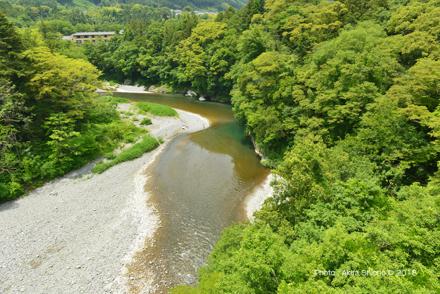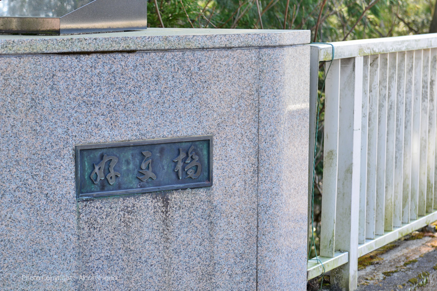 好文橋の架設されている岸は急峻の地形で岸際には木々が生い茂っていています。近くからは橋の橋脚部分の全ては見ることが出来ませんでした。地元のご主人に教えていただいた場所から河原へ降りることにしました。