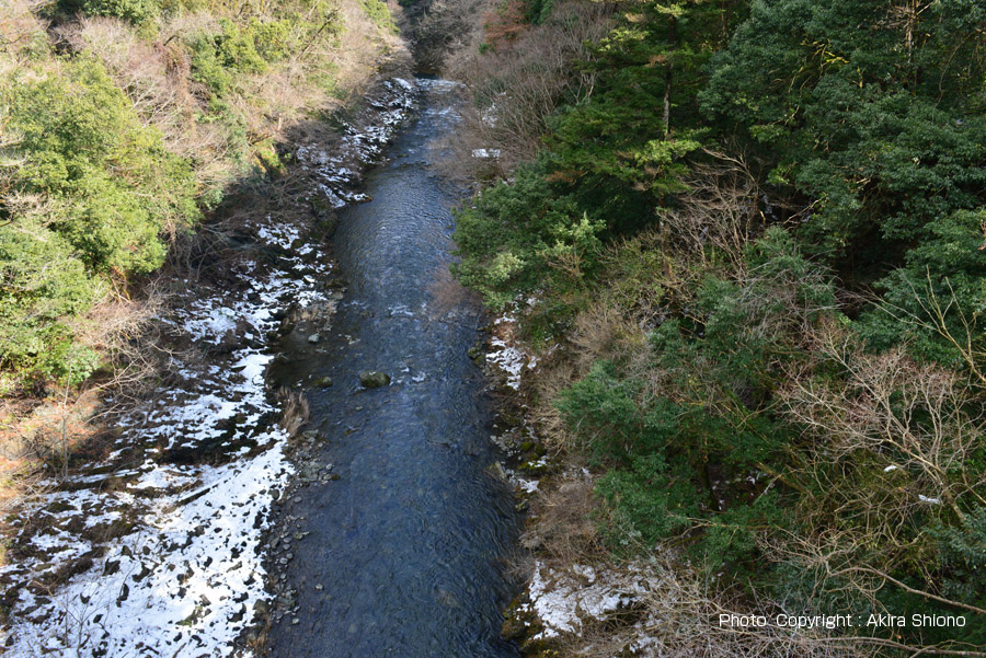 奥多摩駅よりさらに上流に架かる橋1 トップへ 南氷川橋は、JR青梅線終点の奥多摩駅を以前は氷川と呼ばれていたことからこの駅周辺の橋は名前に「氷川」がつきます。駅に一番近い橋は青梅街道が通る「氷川大橋」で、駅前下を流れる日原川上流にかかる橋は「北氷川橋」です。この「南氷川橋」は、青梅街道を奥多摩駅よりさらに奥多摩湖(小河内ダム)方面に向って進むと最初に蛇行をする多摩川上流部に架かる最初の橋です。この南氷川橋は、駅前の商店や街並が途切れた少し先にあります。橋部分はとてもカーブしています。 この南氷川橋の橋柱は御影石を黒御影石でサンドイッチしたようなこの辺りではとても豪華な橋柱になっています。そして銘板もとても重厚感があります。 鋼板ラーメン構造橋 トップへ この橋は橋脚部分は見れませんでしたが、他の方が取り上げている写真を見るとアーチ構造橋です。 南氷川橋の下流と上流の景色 トップへ 南氷川橋から見下ろす多摩川はこのあたりは、比較的ストレートに流れています。大きな岩盤などが無く、白泡を作る荒瀬が特徴です。下流部は凹凸がないのかまっすぐに流れています。