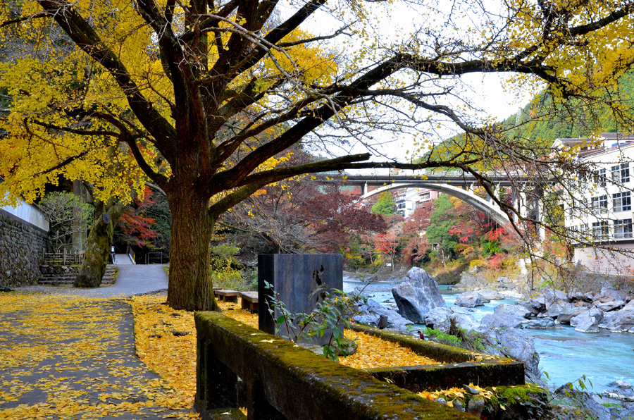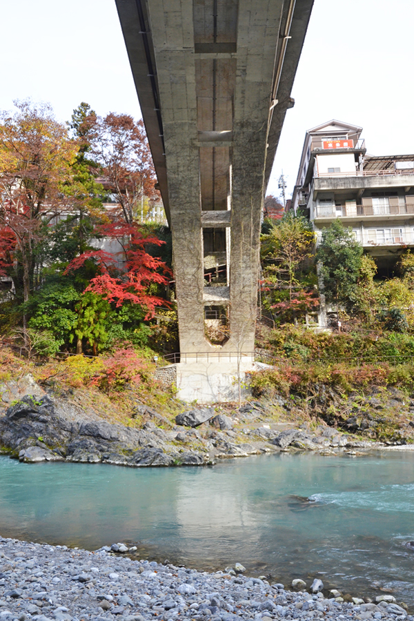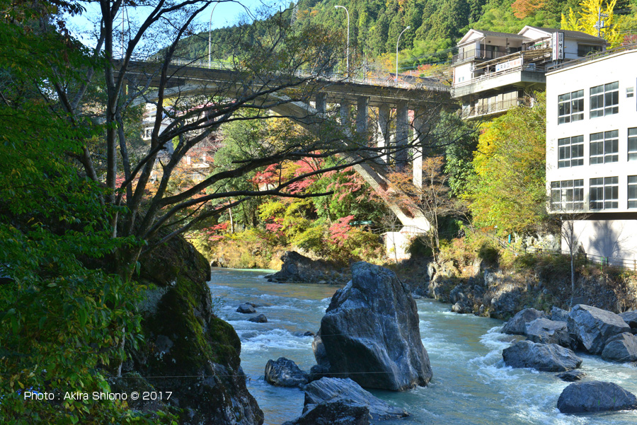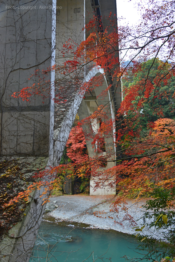 橋台部分は左岸右岸ともに岩盤にしっかり構築されています。コンクリート製のアーチもかなりしっかりした厚みがあります。 御岳橋の直下の四季 トップへ 川合玉堂記念館周辺と御岳橋 トップへ ![]() 玉堂美術館前からみた11月の御嶽橋