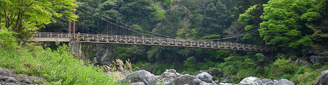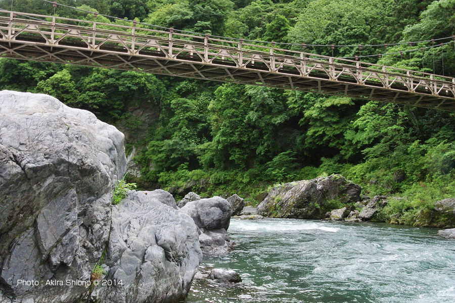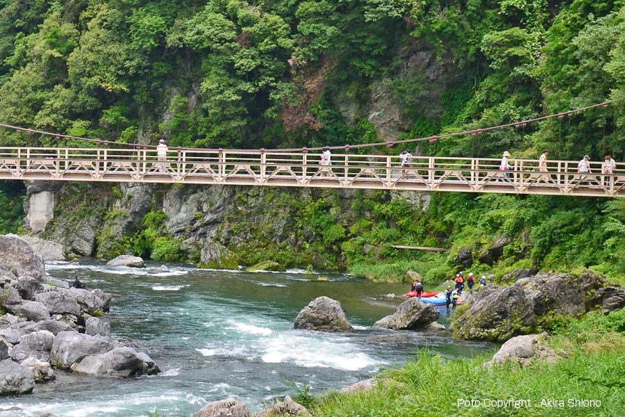 少し左岸上流側から見た御岳小橋で、真下は急流になっています。右は右岸下流直下にある大岩と左に御岳小橋が見えます。 御岳小橋下流の河原からの景色 ▲top 御岳渓谷遊歩道からの景色 ▲top ![]() 御岳小橋上流の御岳渓谷遊歩道の右岸から見た景色橋を人々が渡る景色です。