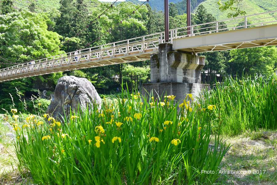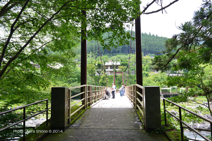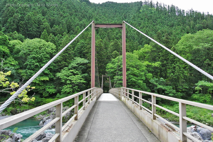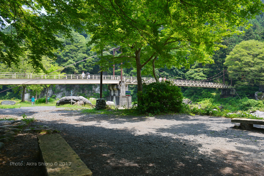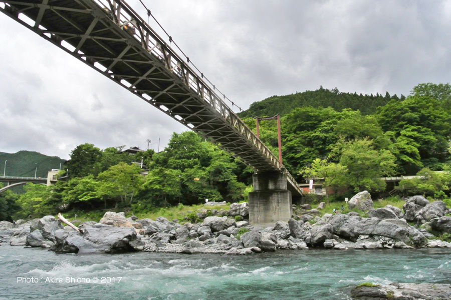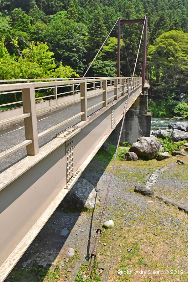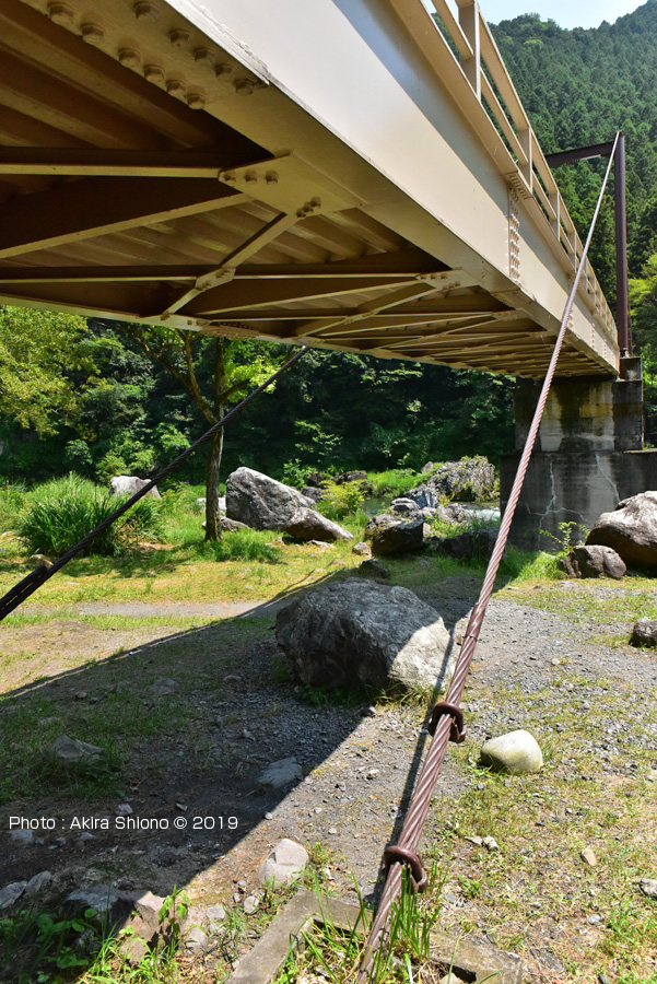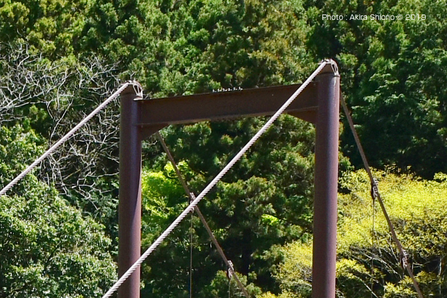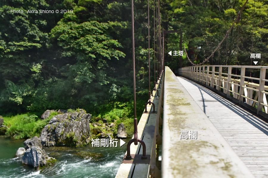 7月の御岳小橋の左岸(御嶽駅側)の上流の景色で支柱から左側は、プレートガーター構造でになっていて通路は舗装されていまます。 撮影:NIKON D800+AFS-NIKKOR 24-70mmG f2.8 NIKON D750+AFS-NIKKOR 70-200mmf4VR 揺れる吊り橋の構造 トップへ