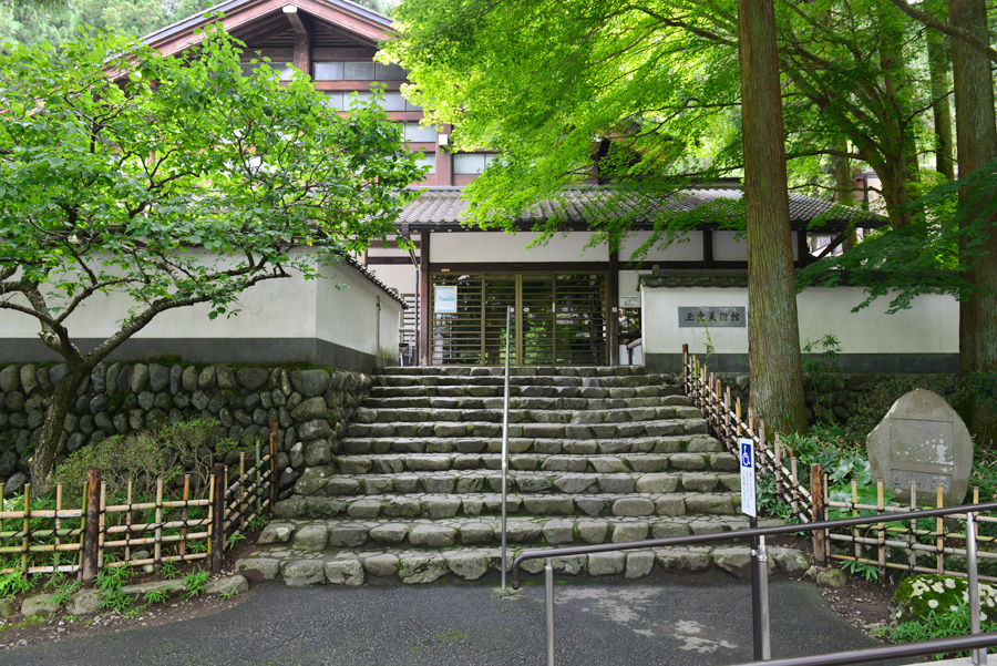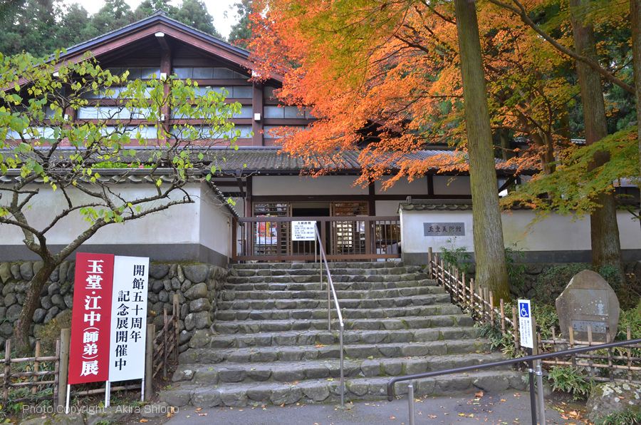 玉堂美術館前から見た冬の石塀と多摩川と御岳小橋 多摩川右岸にある玉堂美術館の入口