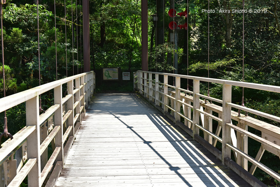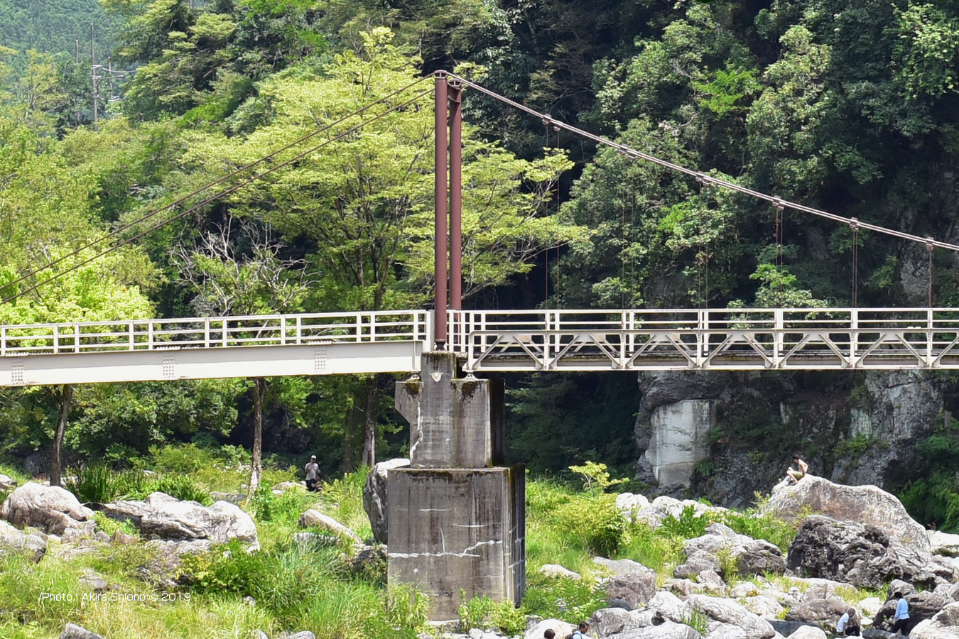 新しい橋の設計が始まるようですが、「既存橋梁の撤去工事について」によると、右岸(南)は斜面を削り、既存の橋の構造物の撤去を行い、左岸では残った橋の構造物の撤去と橋北詰めにあった便所も撤去するとなっています。 在りし日の御岳の吊り橋 〜2019.10.19に流失▲top
