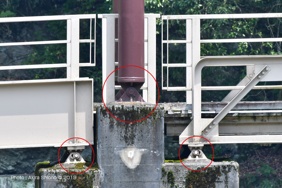 右岸側にあるアンカレイジの拡大写真と、右岸の橋桁の接続箇所は上下の揺れに対して、柔軟に力を分散するように可動するになっています。