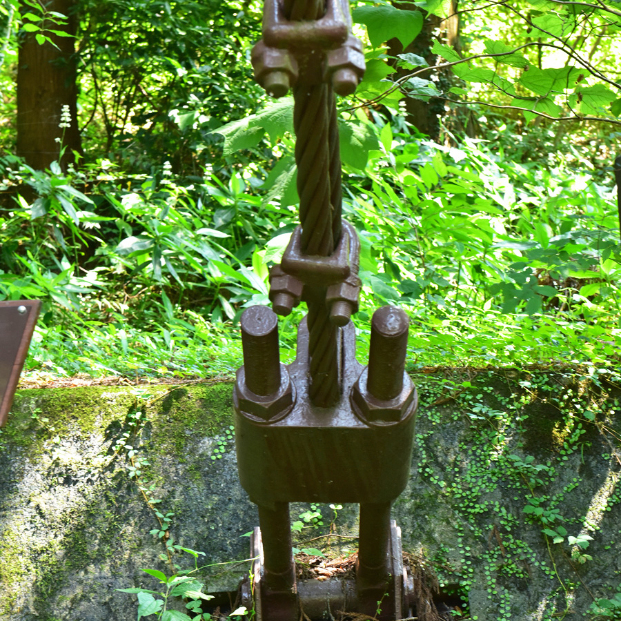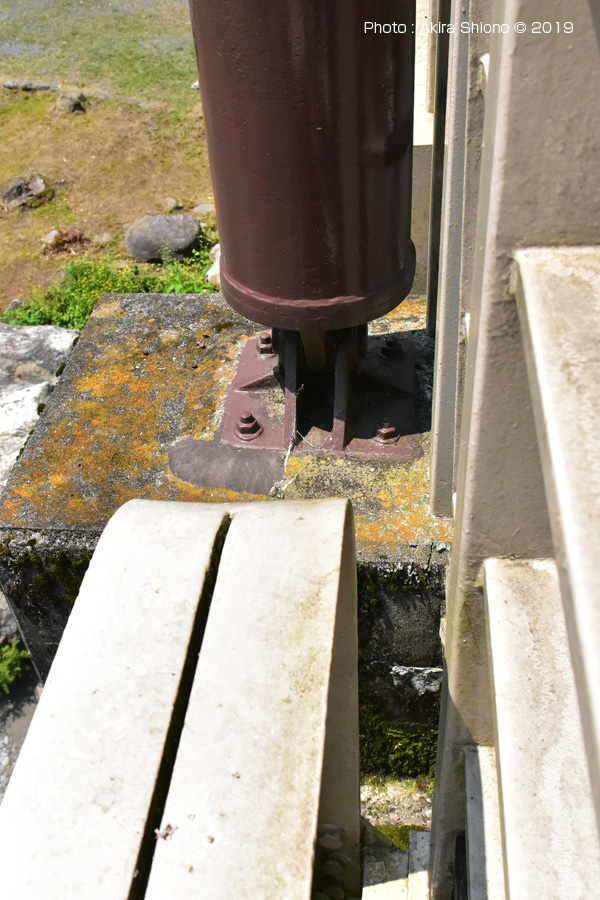 両岸にはワイヤーで吊り橋の床板を支えるワイヤーが両岸に固定されています。橋柱は柔軟な可動式で揺れて振動を吸収します。 ![]() 御岳小橋の右岸の吊り橋の、ワイヤーが固定されている頑丈な橋台(アンカーレイジ)