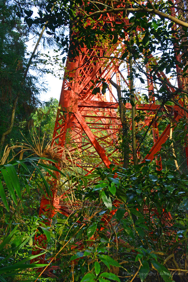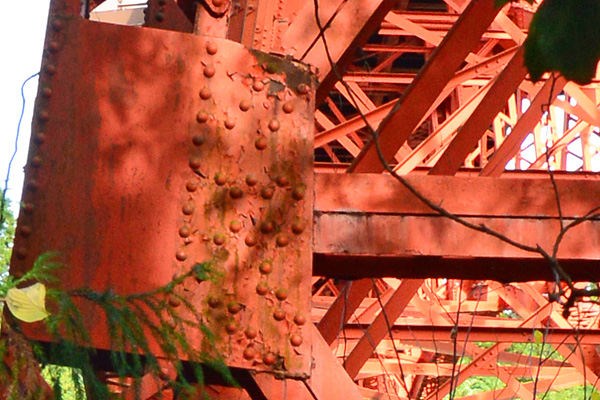 左ー吉野街道側から見たコンクリート製の橋脚で、上には魚腹トラスが2カ所。 右ー薮のなかを降りてゆくと入り組んだ鉄骨構造が見れます