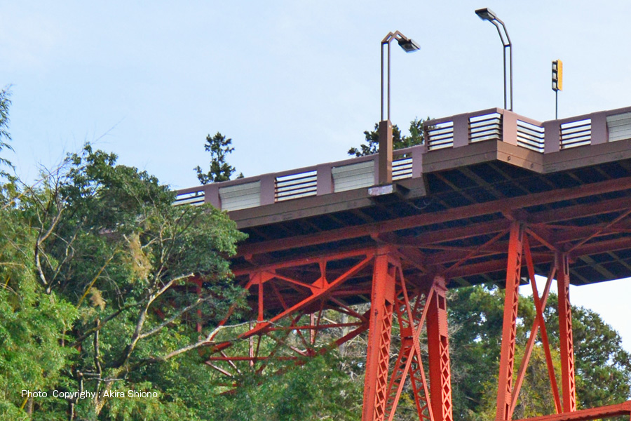 河原から見上げた奥多摩橋の展望デッキ部分と塗装前の状態(2015.11.29) 化粧直し前の奥多摩橋 (2015.11.29)▲top