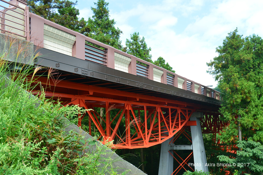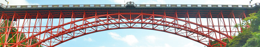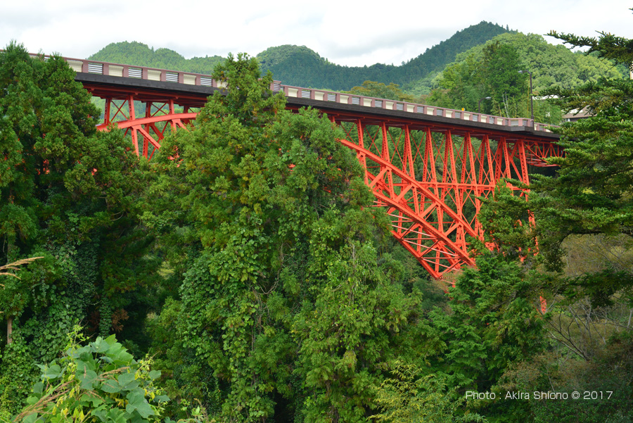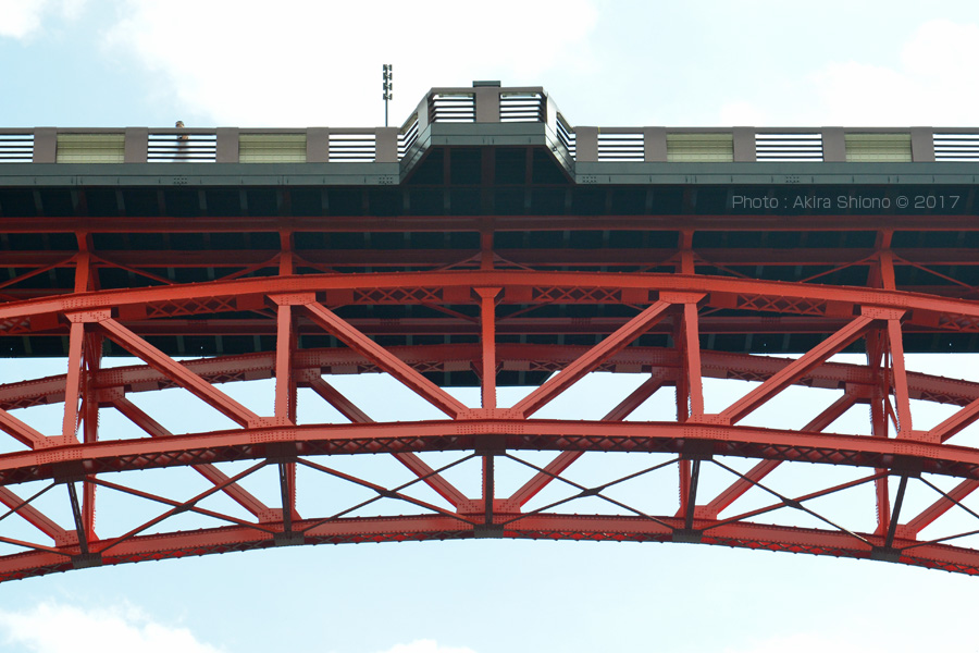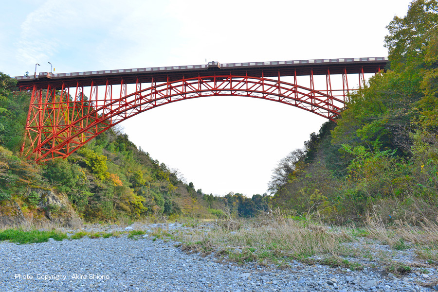 奥多摩橋は、昭和14年に造られた鉄骨構造の道路用の上路鋼アーチ橋です。橋の上はのっぺりしていますが、アーチ構造部分はとても美しく造られています。鋼材のアーチ橋では長い部類に入るとのことです。下方向や、遠くから見ると東京タワーの脚を連想する「鋼材で組まれたアーチ」はとても優美です。 橋の上流・下流の景色 トップへ 2009年に土木遺産認定 トップへ