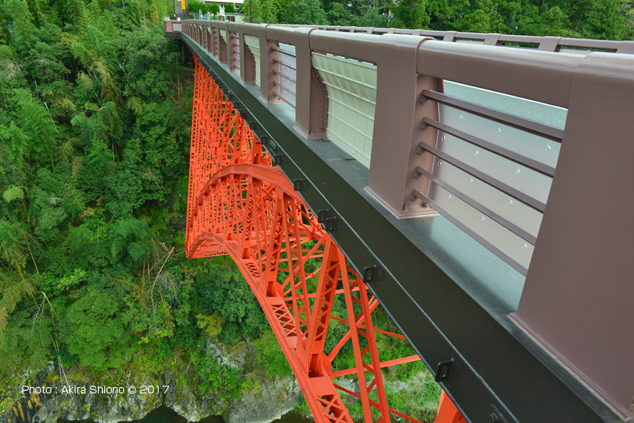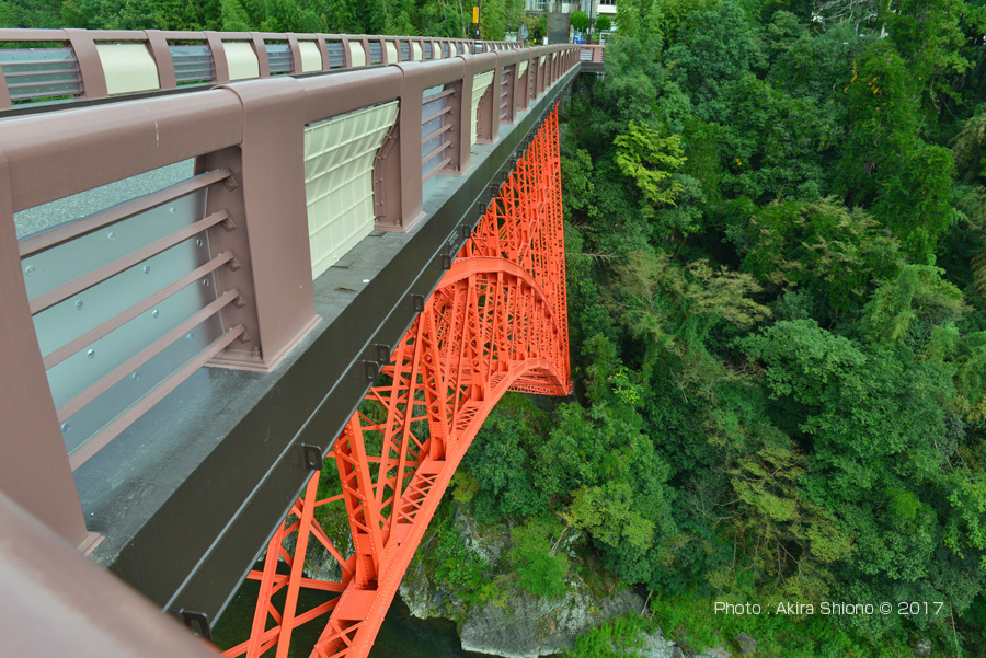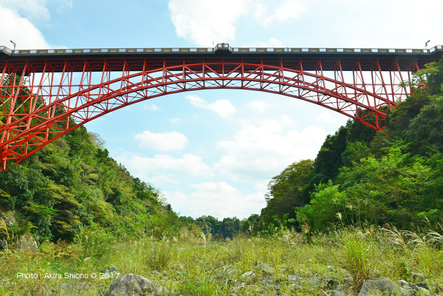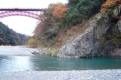![]() 奥多摩橋の展望デッキから北をみた西側のアーチと東側のアーチ ![]() 河原から見上げた奥多摩橋