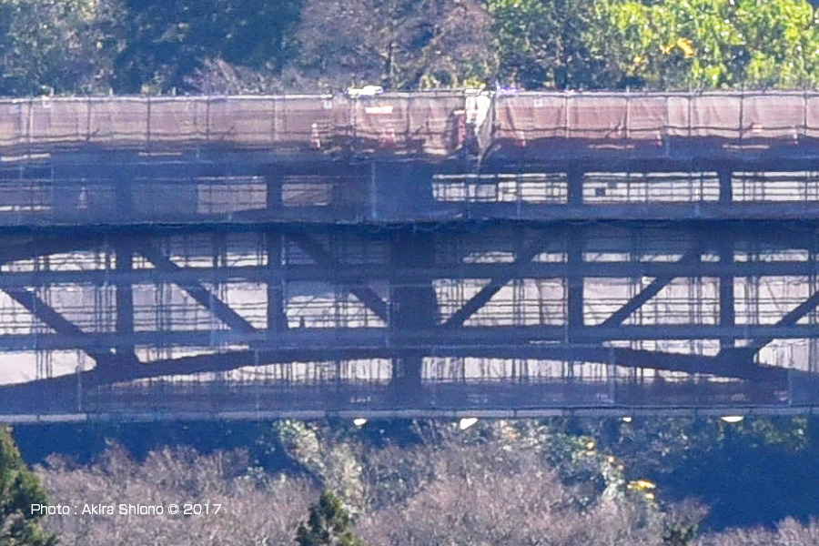 2016年12月11日に軍畑駅から景色を眺めていた時に、目に入ったのが遠くに見えた奥多摩橋が化粧直しの足場が架けられている姿でした。その範囲は、トラスアーチから上路の手筋部分まで行われている様に見えます。幅が100mを超え高さも30mを超える大きな橋ですので、大規模な修繕だったと思われます。