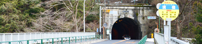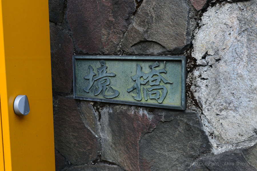 奥多摩駅よりさらに上流に架かる橋7トップへ 青梅街道の最も奥多摩湖に近い橋「境 橋」 境橋は奥多摩湖(小河内ダム)より下の青梅街道かかる橋では、上流から1番目の橋です。青梅街道のバイパスの愛宕大橋信号から、約1.4kmの場所にあります。青梅街道の奥多摩駅からでは最初のトンネル「橋詰トンネル」の出口の先に架かる橋です。この橋も「方杖ラーメン橋」で構造物は道路の真下にあるために、橋梁らしきものは、欄干しかありません。この橋も橋部分の両端でカーブしています。 境橋の橋名板 トップへ 境橋の銘板は、薄い岩を貼付けたモザイク模様になっていて、橋名板は真鍮製でしょうか?緑青が吹いています。 境橋の景色 トップへ 境橋も山間部の橋らしく橋部分は直線ですが、両端は路面がカーブを描いています。この橋の西(奥多摩湖方向)側の右の道を右折すると「境渓谷キャンプつり堀場」があります。 境橋の下流と上流の景色 トップへ