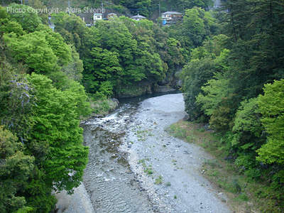 5月の昭和橋の上からみた下流(青梅市街方面)の景色と上流(奥多摩駅方面)の景色。