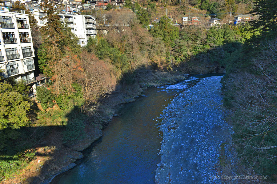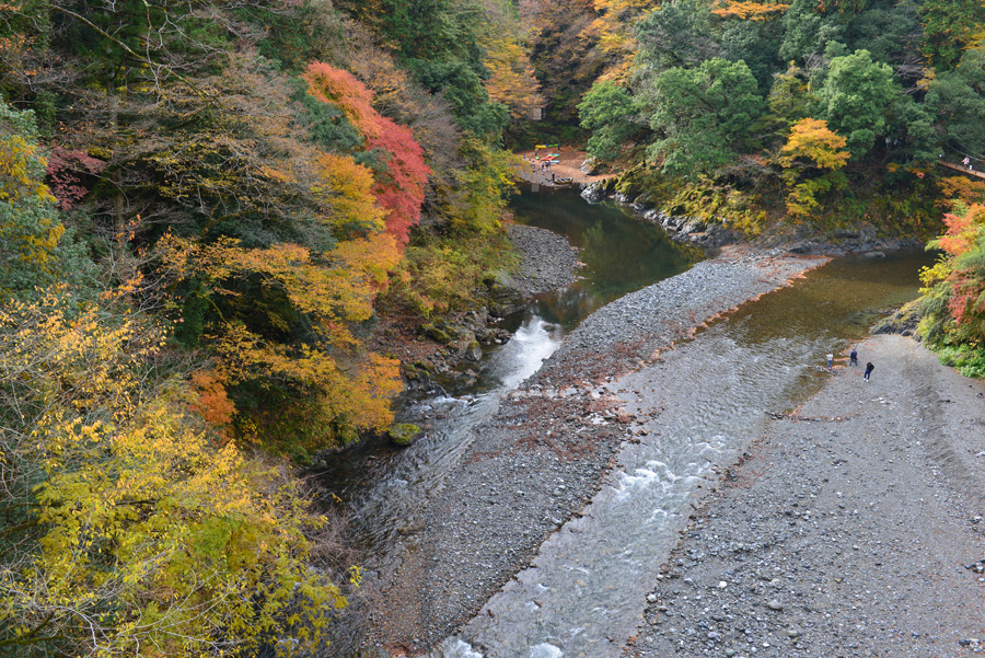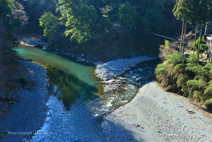橋名板は左手が漢字の『昭和橋』で、右手が『しょうわばし』とあります。 昭和橋の下流と上流の景色 トップへ 昭和橋から見た下の景色は、下流川は「氷川キャンプ場」、上流側は日原川と奥多摩川の合流を見ることが出来ます。キャンプシーズンになると下流側の景色は若者達の賑わいを見ることが出来ます。合流地点の多摩川は流れがゆったりと下流れで、日原川とは違った光景になっています。初夏の景色と違って、冬は陽が傾くので山陰が河原を覆ってしまいます。