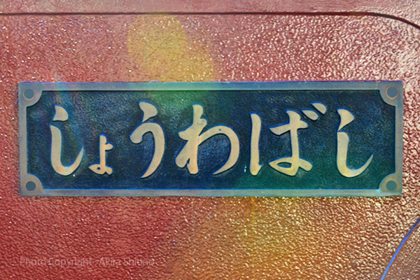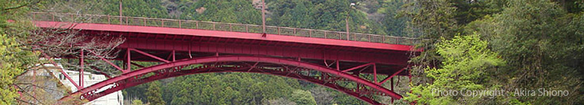 JR青梅線の終端の奥多摩駅の近くにある橋です。この橋は、奥多摩駅から近くの「氷川キャンプ場」へ向う多摩川南岸道路の愛宕トンネル入口手前に繋がる道に架かる橋です。このまま東へ進むと海沢大橋を渡り、青梅街道へと繋がります。奥多摩駅近くには、青梅街道沿いにRCコンクリートアーチ橋があります。こちらの昭和橋は鉄骨で組まれたアーチ橋となっています。 橋名板と橋上から見た景色 トップへ 昭和橋から見た下の景色は、下流川は「氷川キャンプ場」、上流側は日原川と奥多摩川の合流を見ることが出来ます。キャンプシーズンになると下流側の景色は若者達の賑わいを見ることが出来ます。合流地点の多摩川は流れがゆったりと下流れで、日原川とは違った光景になっています。2018年には、河川標識と同デザインの橋梁標識がここ昭和橋にも設置されていました。