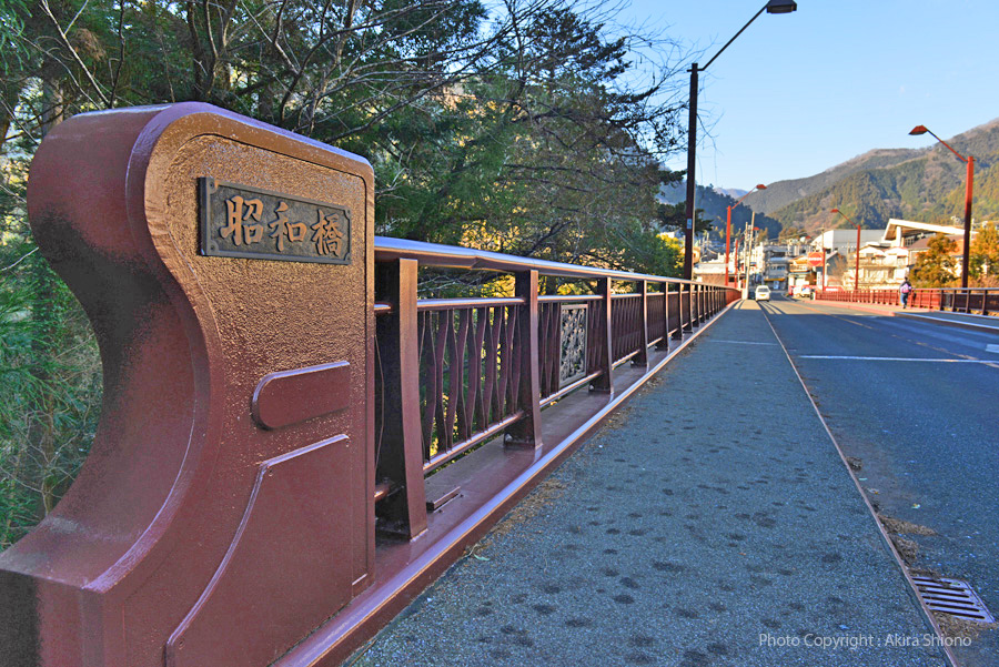 右岸南端の景色で、橋は褐色に近い色に塗り替えられています。昭和橋の先には奥多摩駅近くの交差点が見えます。