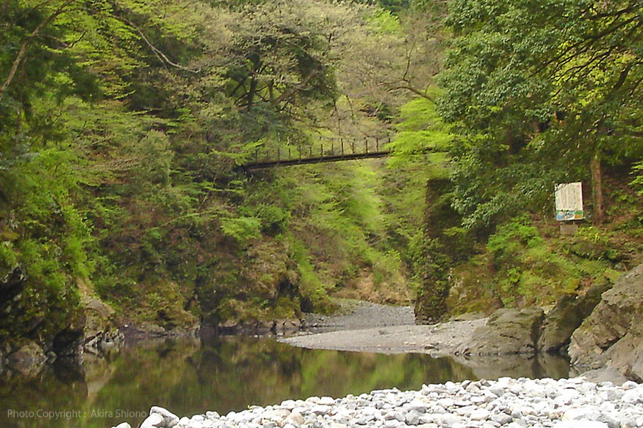 合流上流の日原川に架かる吊り橋「氷川小橋」の景色と合流上流の奥多摩湖方面に架かる吊り橋は「登計橋」。