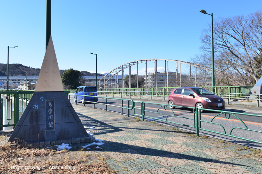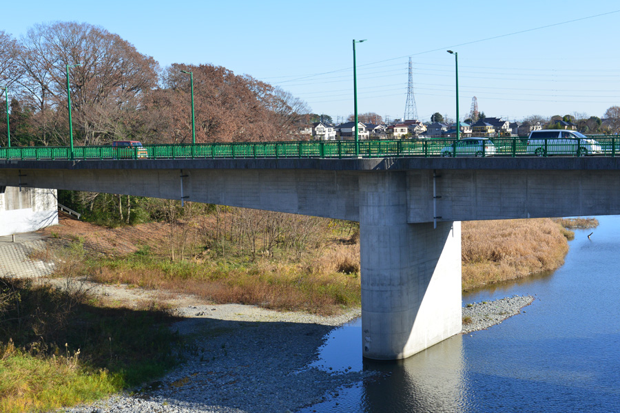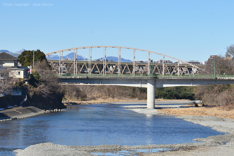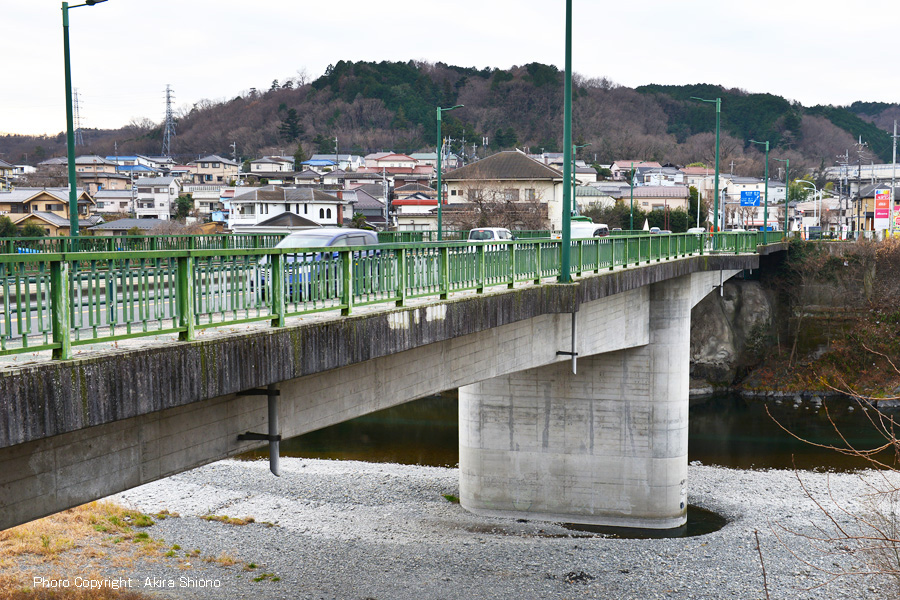 【多摩川橋】 むかしこの地に「友田の渡し」があり人々の往来が絶えなかったか、川の水かさが増すと舟がとまり、その度に難儀していたという。 交通量が多い多摩川橋はRCコンクリート橋 トップへ 奥多摩街道や青梅街道から奥多摩に向う方法の一つがこの多摩川橋を通り、吉野街道へ向う時に通るのがこの橋です。奥多摩方面へはこの先のY字路の信号を右折します。 用途別の3種類の橋 トップへ この時は1月で草木は枯れていて褐色系の風景になっています。下流川には小作堰管理橋がはるか遠くにみえます。また上流川には、ライフラインの水道管を南の岸に繋げる「友田水管橋」が間近に迫っています。上流部の橋と違って、この辺りは流れは緩やかになり、また河川敷もかなり広く川幅も広くなっています。 多摩川橋は交通量の多い橋 トップへ