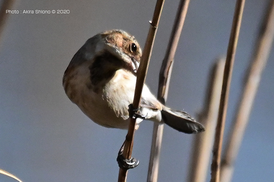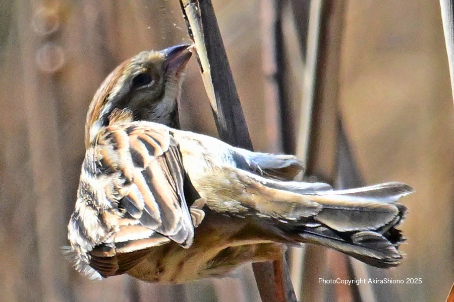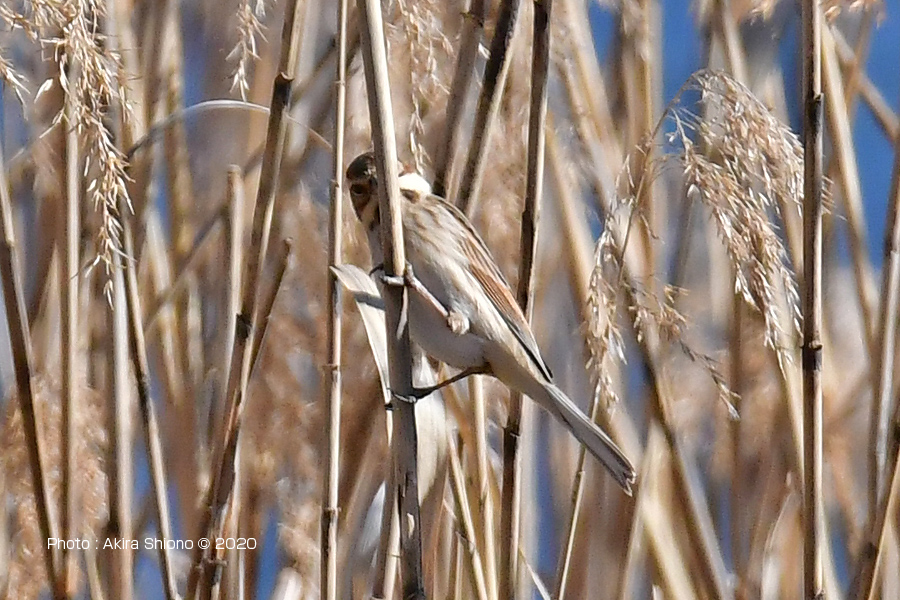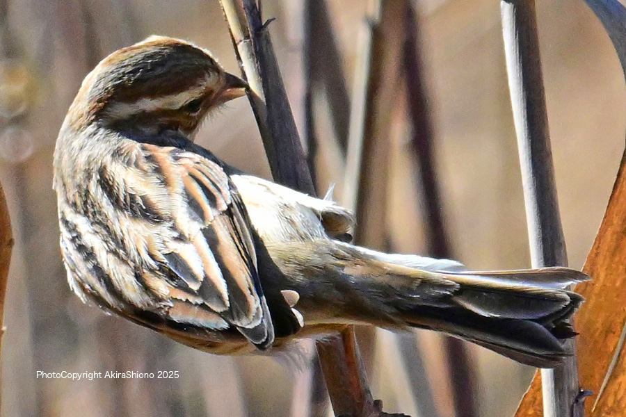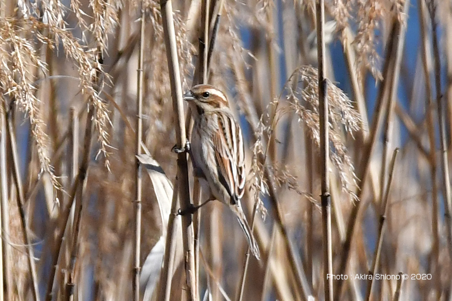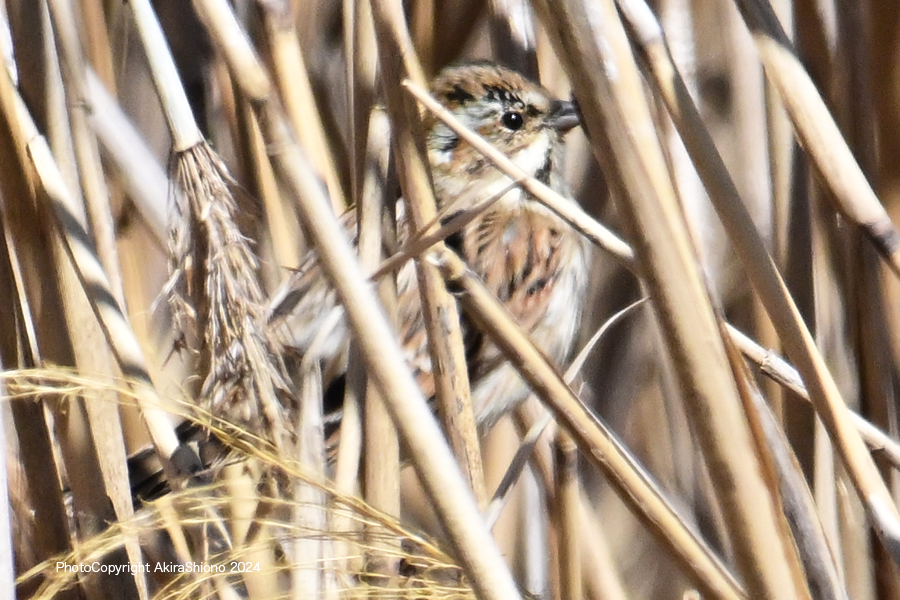 勢いよく突付き破片が鼻散り、幼虫を見付けたように見えます 撮影:NIKON Z9+Z400 f/4.5S+TC-2.0 DX1200mm ISO 2500 1/1250 f16 0段手持ち 2.5倍トリミング オオジュリンは、スズメ目ホオジロ科ホオジロ属の野鳥で同科のカシラダカと似ています。しかし、柄が前後(留まると縦模様)に入っていて足などに留まると同化して葦に溶け込んでしまいます。お腹の部分は白くなっています。オスは冬はメスを色合いが似ていますが、オスの夏羽は頭部と喉部がが黒になっています。冬羽は下の画像にあるように足の縦方向の柄に溶け込むようになっていて、猛禽類からも目立たないものになっています。冬場でオオジュリンを探すときも目を凝らして探しながら、鳥が動かないと見つけることが難しいかもしれません。 3月中旬のオオジュリンの幼鳥 2月下旬のオオジュリン ![]() 川辺の葦に留まるオオジュリンで体色が葦と同化していています。