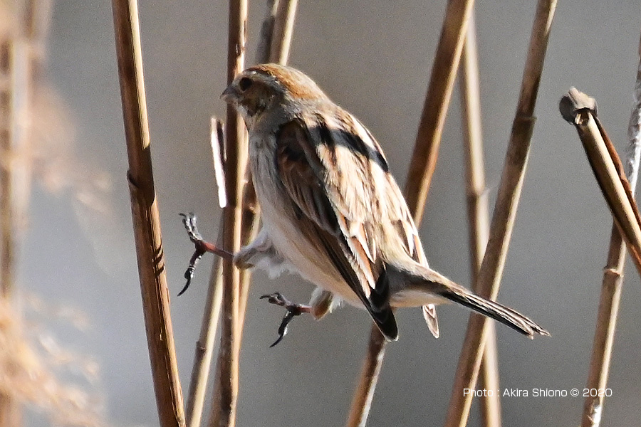 葦から足へと飛び移るオオジュリン 撮影:NIKON Z6+AF-S200-500mm+TC-20EIII 1000mm相当 柵に固定して手持ち撮影 2月上旬のオオジュリン