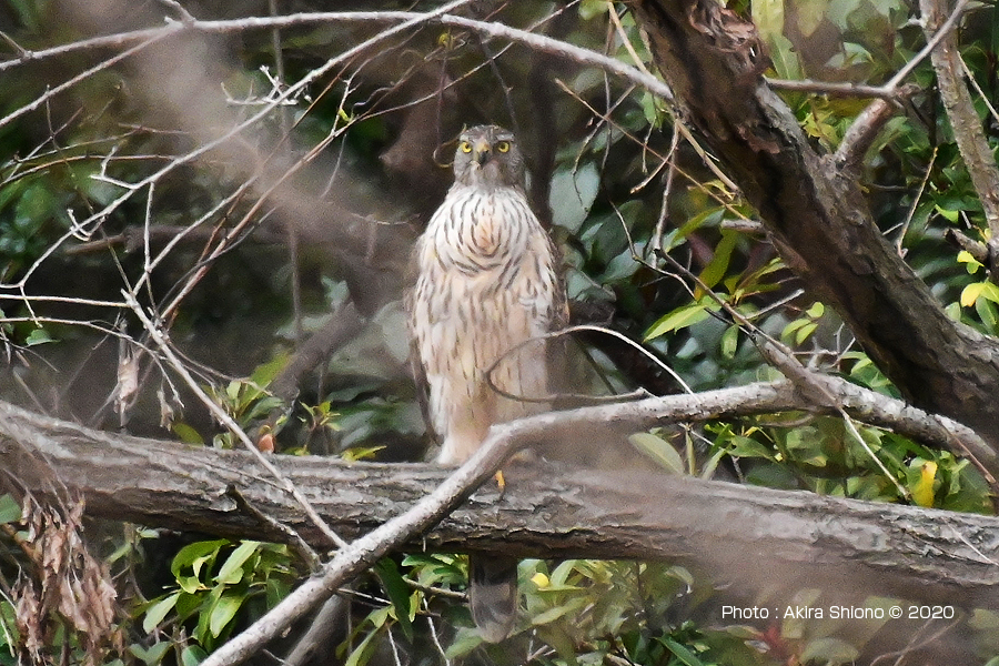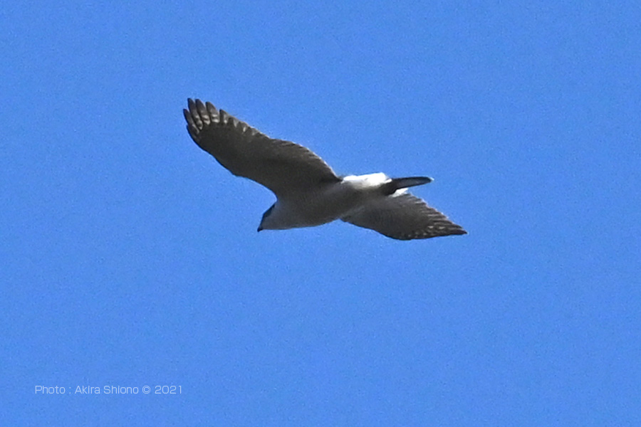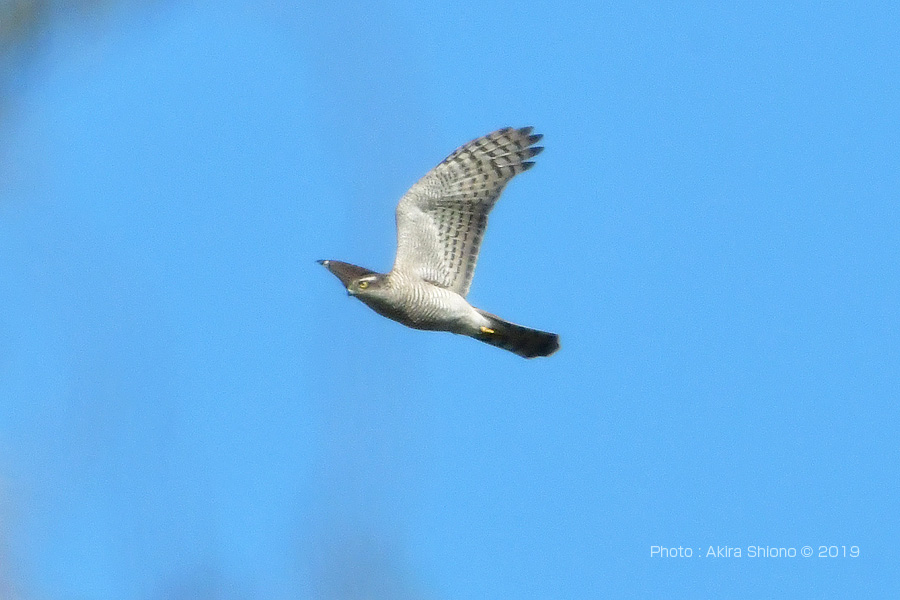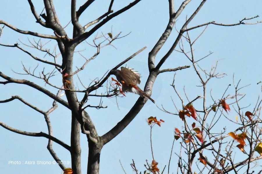 オオタカはここでかなりの時間じっとしていた様です。 撮影:NIKON Z6II+TC-14EIII+AF-S200-500mmE f5.6 DXモード1050mm相当 ISO1250 1/2000 F/13 手持ち撮影 トリミング 下尾筒を広げて飛ぶオオタカ:2月 トップへ 野川公園で野鳥を探していると、木々の枯れ枝が覆う上空で旋回している猛禽がいるのを発見しました。枝の間からの撮影で開けた撮影環境ではなかったので、かなり厳しい条件でした。 見上げたこの猛禽の腹・翼の裏側の色は肉眼ではかなり白っぽく見えました。追うのには望遠端が無理でしたので、1.4Xのコンバーターで514mmという比較的広い範囲で追いました。あまり綺麗に取れていませんが、頭部の黒っぽい色など一番近いのが「オオタカ」と判断しましたが、尾羽の付けにに白い羽毛の様なものが広がっているのは、尾羽の付け根部分に生える「下尾筒」です。またその分、尾羽が妙に細くなっているのが見えます。光の関係で翼の模様がはっきりしないのが残念です。 3月東京港野鳥公園の空を飛ぶオオタカ トップへ 鬱蒼とした森の中の太い枝に留まるオオタカ トップへ ![]() 平に伸びた太い枝で獲物を探すオオタカでで胸の模様が縦になっているので若鳥の様です。 ![]() かなり時間が経ってやっと移動したオオタカで足が黄色いのがわかります。 ![]() 移動場所を決めたオオタカで、両脚がハッキリと見えます。 撮影:NIKON Z6+TC-20EIII+AF-S200-500mmE f5.6望遠端1000mm カラスに追い立てられるオオタカ トップへ しばらく太い枝に留まっていたオオタカは少し移動しました。その後に周りの様子が変わったようです。周りを見ると二羽のカラスが、おそらくカラスが子育てでもしているのでしょうか、またオオタカは若鳥なのでカラスはをテリトリーから追い出すように怖がらずにsオオタカにジリジリと近づいて行きました。 鷹にカラスが食べられている動画を見たことがありますが、集団でその鷹を引き離すようにの尾を引っ張っているものでした。カラスは複数で強敵に向かってエリアから追い出すのをノスリの撮影の時でも見たことがあります。 その後、残念ですが目を離した瞬間にオオタカとカラスはどこかに飛び去ってしまったようです。 ![]() 太い枝に留まっていると二羽のカラスがオオタカを追い出しにやってきました。