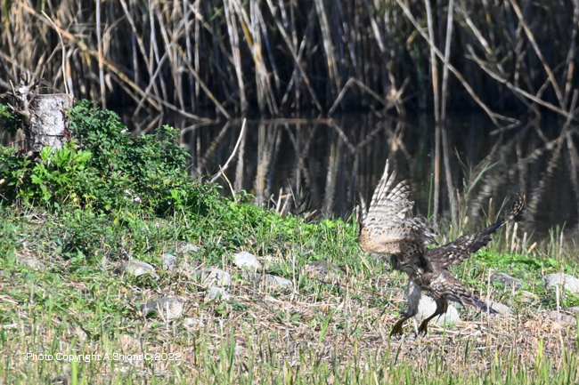 ふと出掛けた日に、少数の人が長いレンズを遠くに向けているのを見つけました。こちらも探してみることにしました。手持ちのレンズの最大焦点距離(DX時に1050mm)にして探してみると、約100m先に草むらの中に何やら猛禽類らしい姿を発見。最初はトビかなぁ?と思っていました。しかし、羽ばたいた時に翼の裏側が白っぽい模様だったので、オオタカの可能性が出てきました。成鳥のオオタカは狩り以外には、地面にほとんど降りたのを見たことがないので、勝手に幼鳥と判断しました。長い間じっとしていた様ですが、そのうちにその内に少し先にあった少し高い切り株に羽ばたいて留まりました。