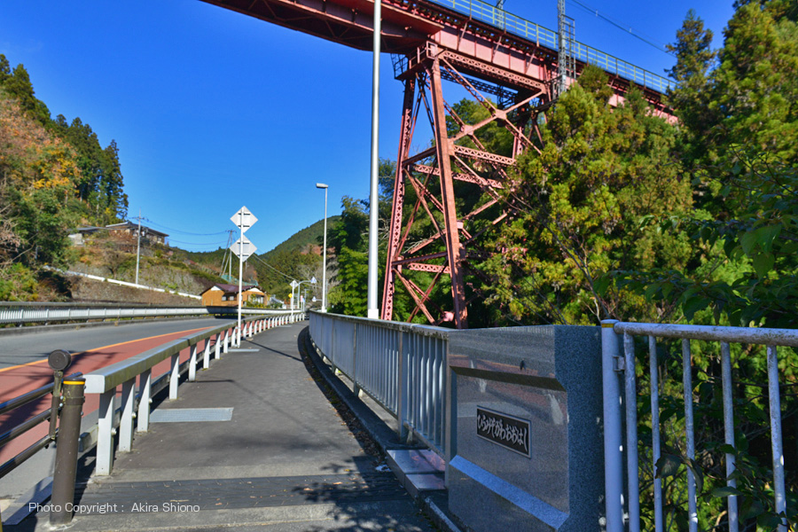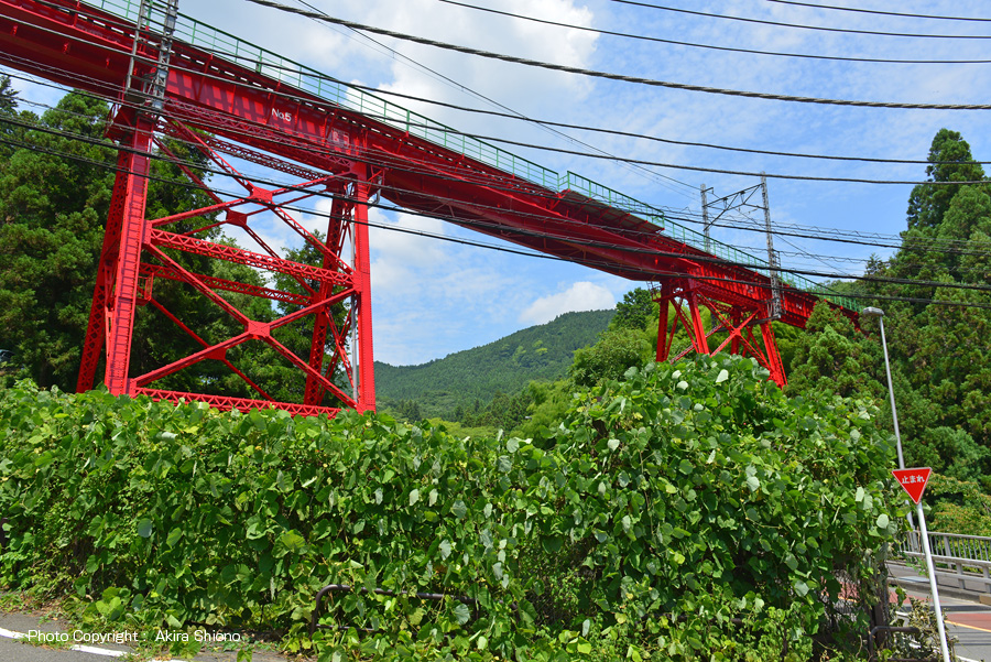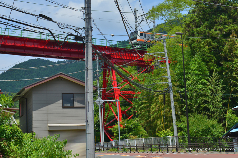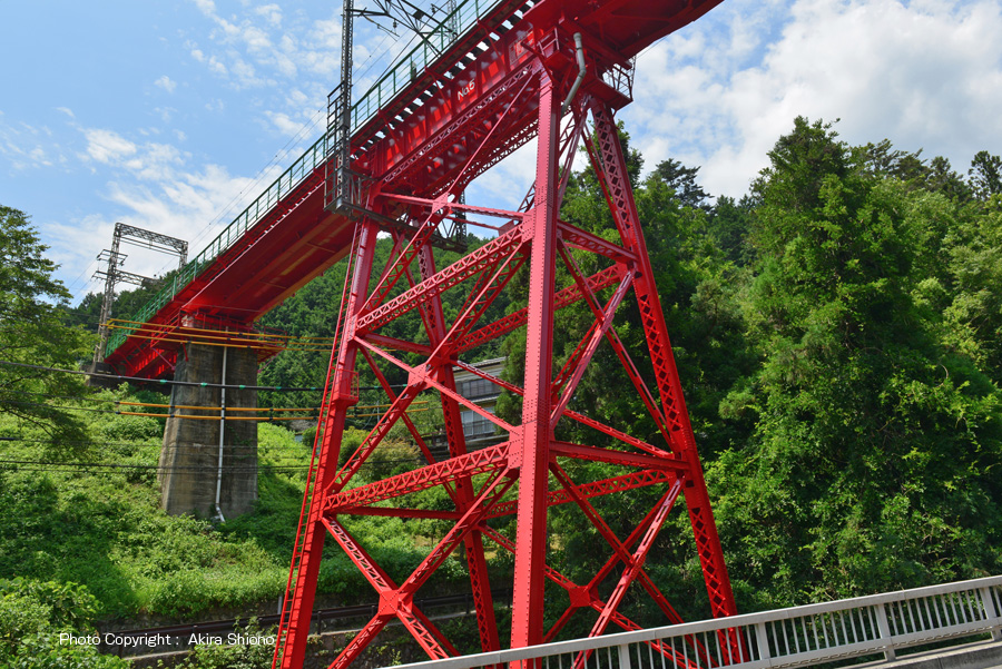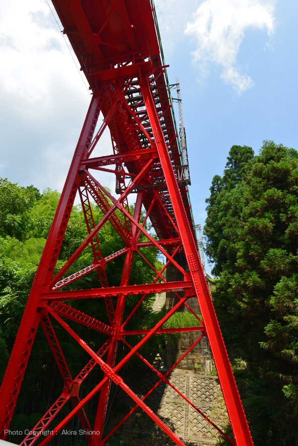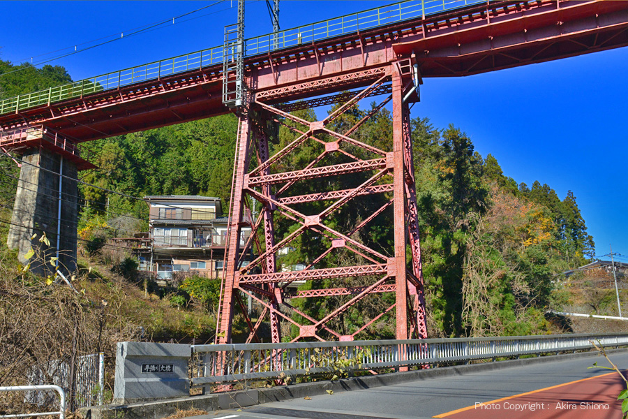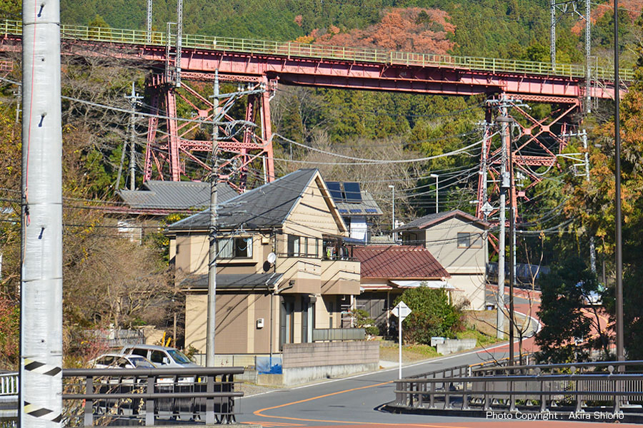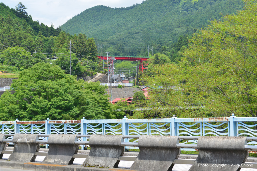奥沢橋梁は多摩川の軍畑大橋北の青梅街道の軍畑駅入口交差点を、北に向う場所に架かっています。この道にもこの辺りを蛇行する平溝川をまたぐ平溝川大橋の真上にあります。また、吉野街道と青梅街道を繋ぐ軍畑大橋からも山腹に架かるこの奥沢(軍畑)橋梁を見る事が出来ます。 奥沢(軍畑)橋梁を近くから見る トップへ ![]() JR青梅線の奥沢橋梁を西側から見た景色で赤い色が景色に映えます。