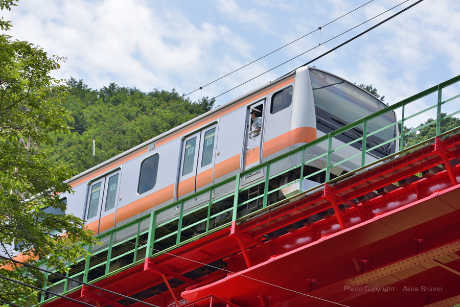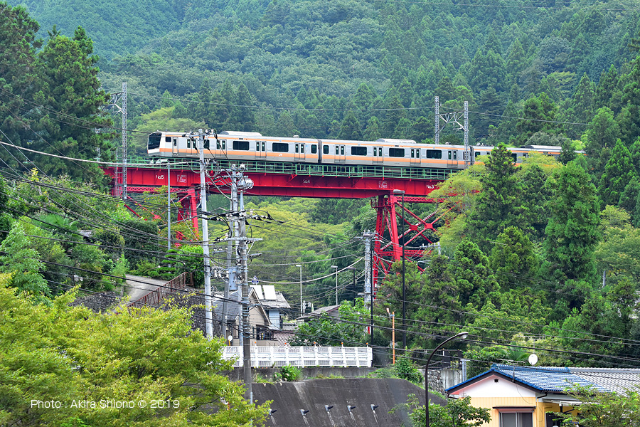 日向和田駅から西は、JR青梅線は山腹の様な場所を通る事が多くなっています。青梅街道は多摩川近くにあり、このJR青梅線は、さらに新宿から山梨の甲府市まで続く江戸時代からの交通の大動脈であった青梅街道近くに建設されています。山が多くなる軍畑から奥多摩駅あたり迄は、山の中腹に建設された駅が多くなります。また山が多いという事は多摩川に流れ込む沢や、川があり青梅線もこの様な場所を跨ぐように橋が渡されています。 景色に映える塗替え後の奥沢橋梁 トップへ ![]() 軍畑大橋から約400m北側にある、JR青梅線の軍畑駅東の奥沢橋梁。(塗り替えは2017.7)