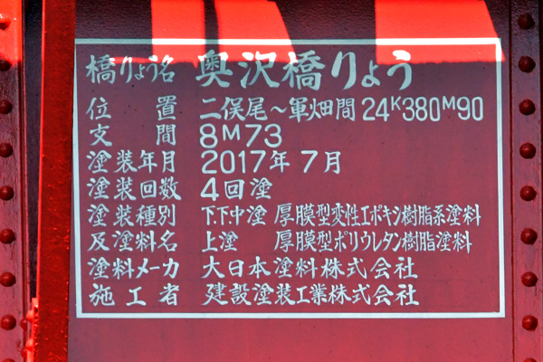 JR青梅線の軍畑駅東の平溝川に架かるこの奥沢橋梁は、2017年7月に塗り替えが行われました。前回奥沢橋梁を訪れたのは2017年2月で橋梁の塗装はかなり傷んでいました。